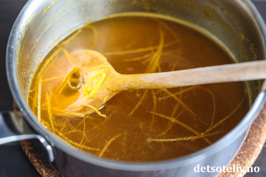 Tilsett fint strimlet appelsinskall. Avkjøl appelsinsausen til den er helt kald.