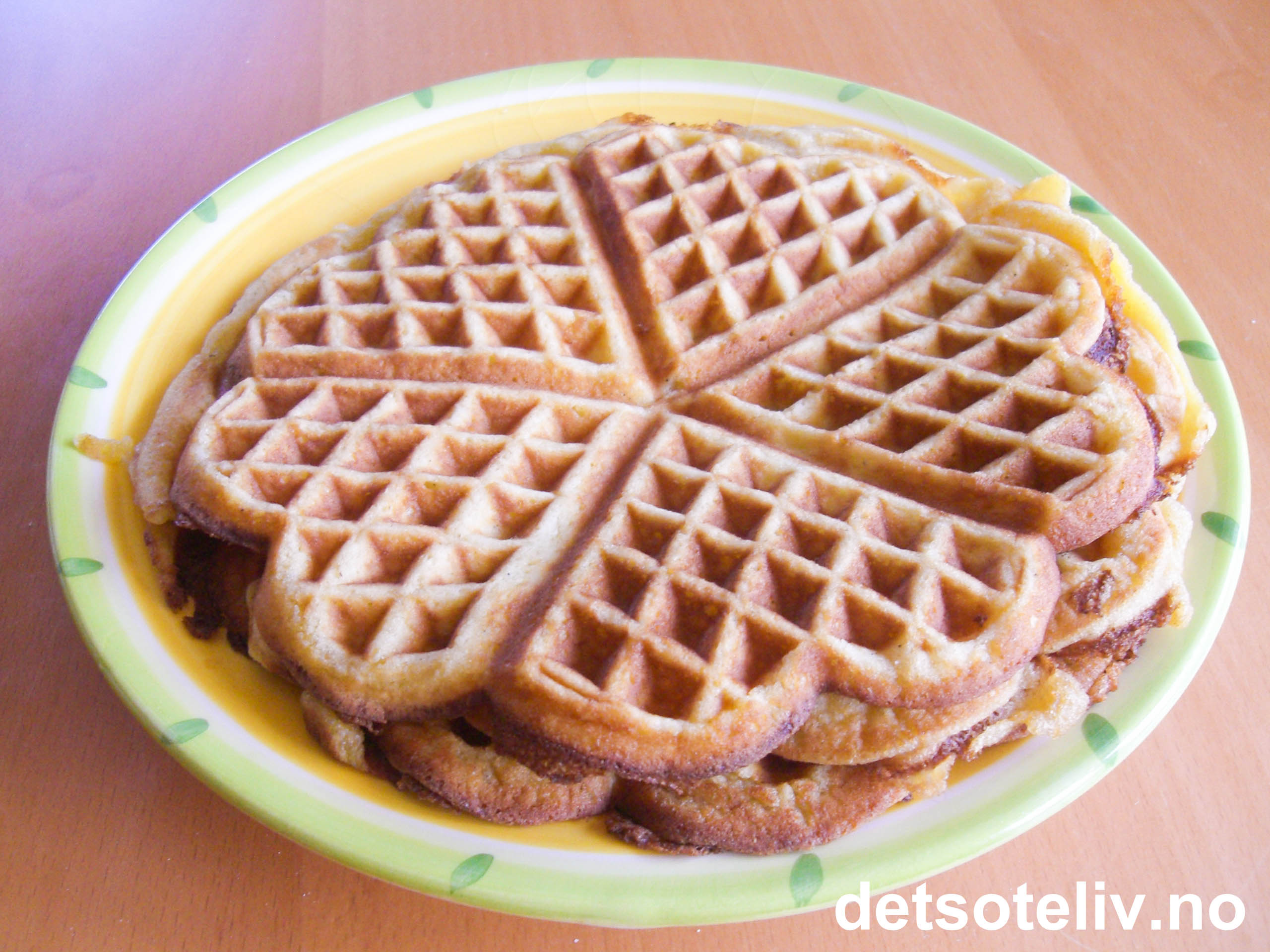 Stek vafler i vaffeljern. Bruk formspray eller litt ekstra smør under stekingen.