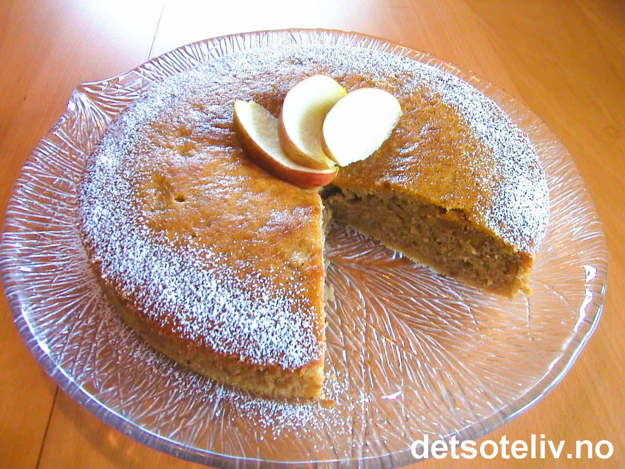 Løsne kaken fra formen med en skarp kniv. Ta kaken ut av formen og fjern bakepapiret. Sett kaken på et passende fat og sikt over litt melis. Pynt kaken eventuelt i midten med noen få epleskiver rett før servering.