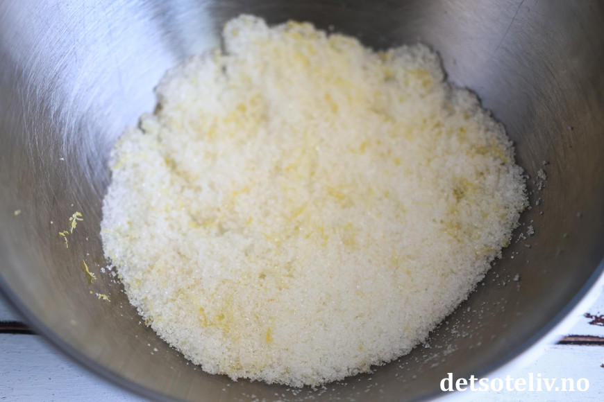 Ha sukkeret i en bolle og tilsett fint revet sitronskall. Gni sitronskallet godt inn i sukkeret. Dette gjør at aromaen fra sitronskallet kommer ekstra godt frem i kaken.