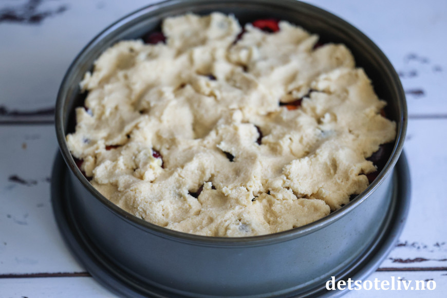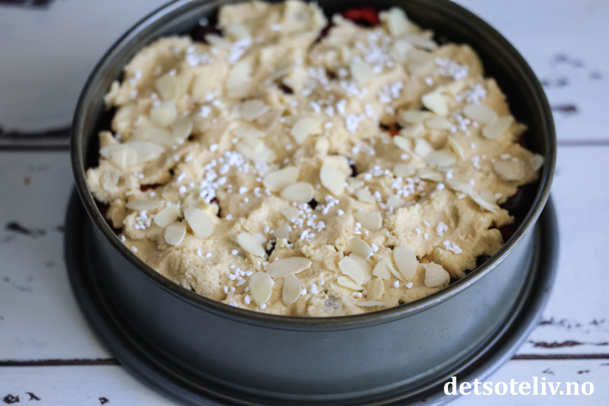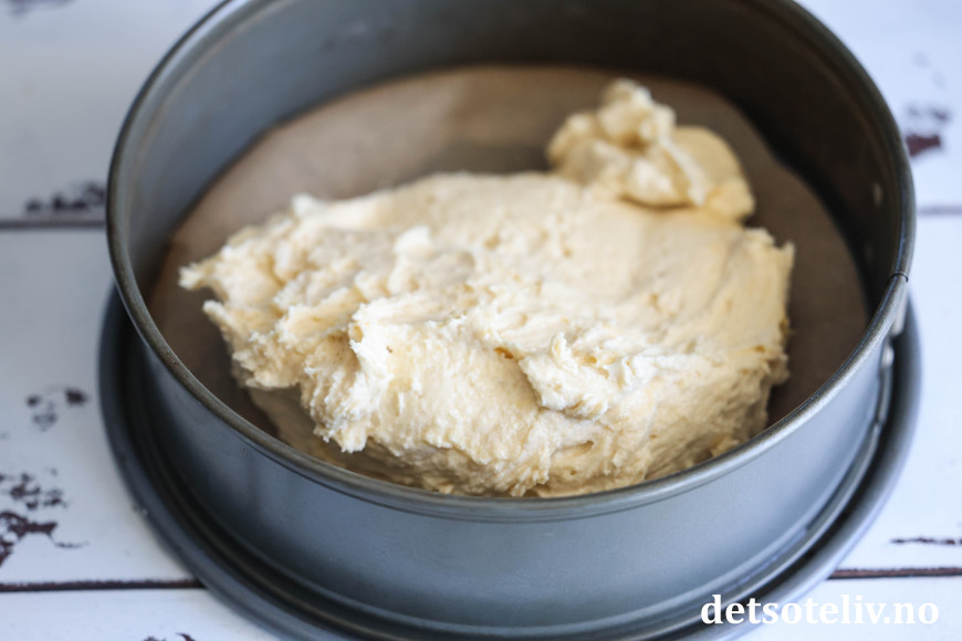 Ha deigen i en rund kakeform (24 cm i diameter) med bakepapir i bunnen.