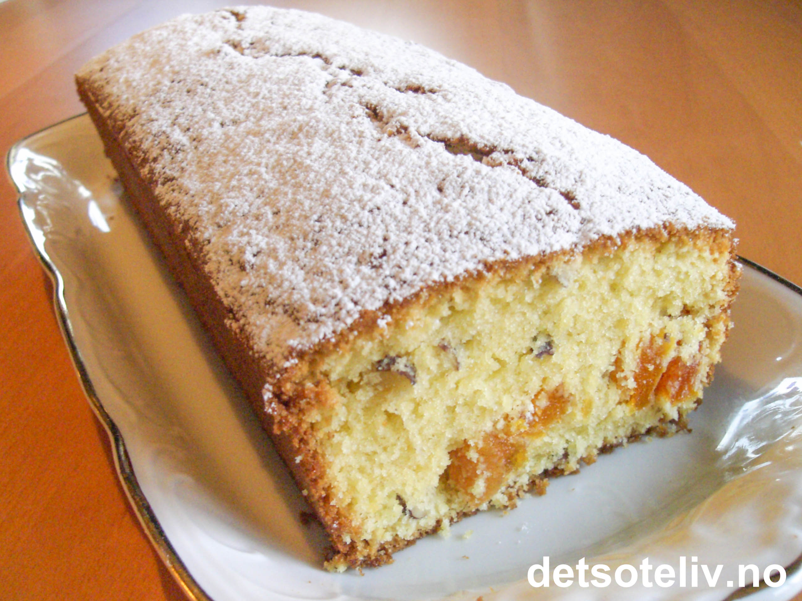 Ha deigen i en smurt, avlang brødform (1,5 liter), som er dekket med et stykke bakepapir i bunnen. Stek kaken på rist nederst i ovnen ved 180°C i ca 45 min. Avkjøl kaken i formen i noen minutter før den forsiktig løsnes fra kantene på formen med en skarp kniv og hvelves ut av formen. Fjern bakepapiret og sett kaken på et passende fat.