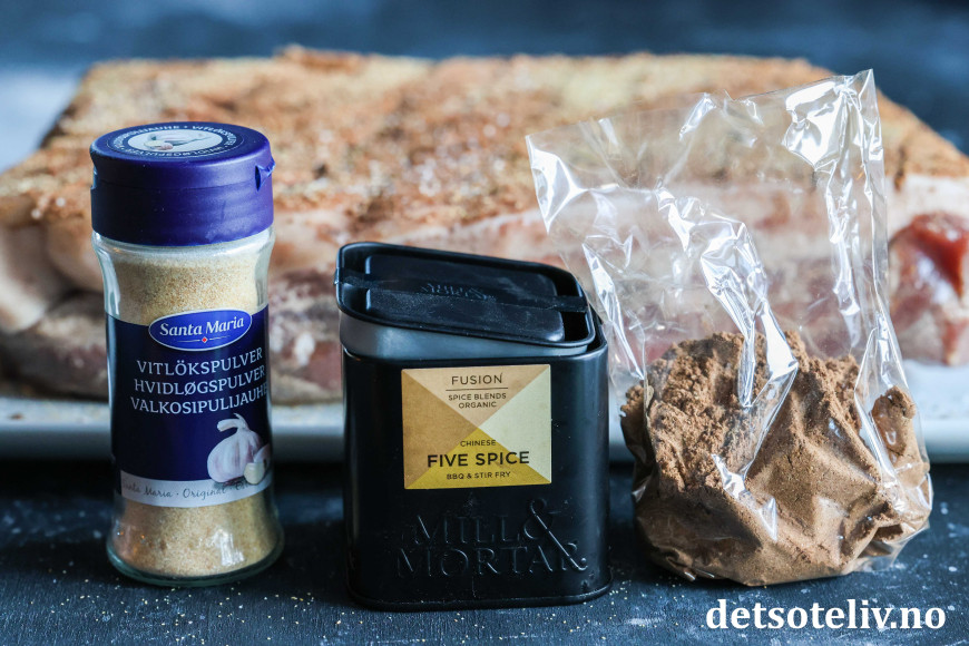 Bland sammen salt, pepper, hvitløkspulver og five spice. Dryss krydderet på ribben og gni det godt inn i svoren.