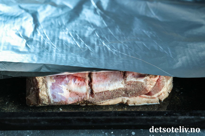 Legg ribben med svoren ned i en form og dekk til med aluminiumsfolie. La ribben stå slik i kjøleskapet over natten.