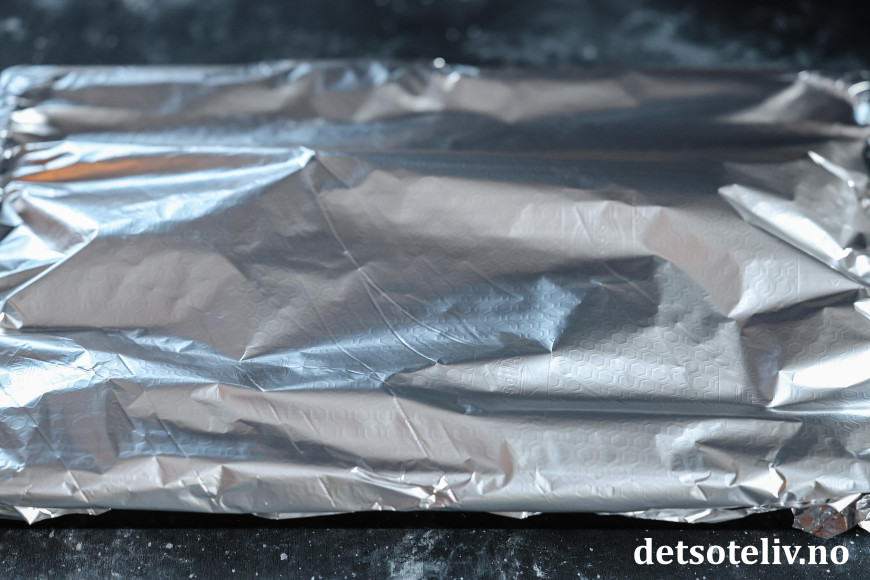 Ta langpannen ut av ovnen og fjern forsiktig aluminiumsfolien (vær forsiktig så du ikke får den varme dampen i ansiktet).