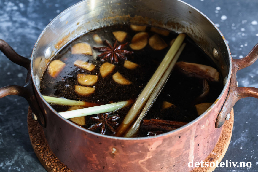 Ta kjelen av platen og tilsett riseddik, fiskesaus og sesamolje. Finhakk hvitløk. Skrell og riv ingefær. Ha begge deler i kjelen. Kutt til sitrongresset og bank flat slik at den nederste delen knuser (slik at smaken frigjøres). Ha sitrongresset i kjelen. Tilsett kanelstang og stjerneanis.
