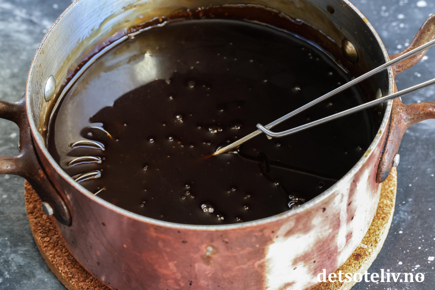 Mens ribben hviler, kan du lage sausen. Start med å sile av og måle opp ribbesjy fra langpannen.