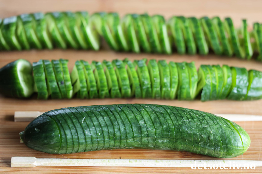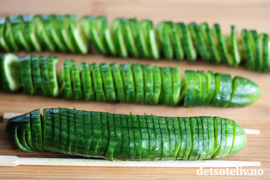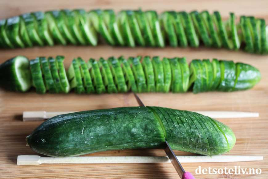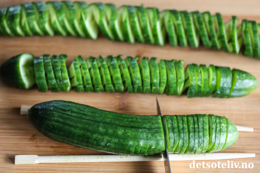 Igjen vil spisepinnene hindre at du skjærer helt igjennom agurken.