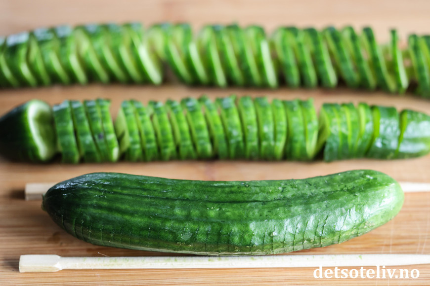 Legg en agurk foran deg. Legg en spisepinne på oversiden og en på undersiden av agurken. Bruk en liten, skarp kniv og skjær agurken i skiver på skrå. Skivene skal være ca. 0,5 cm tykke.