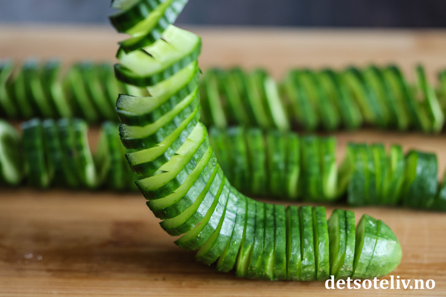 Snu agurken slik at snittsiden vender ned mot bordet. Igjen er det viktig at du har en spisepinne både på oversiden og på undersiden av agurken. Skjær nå agurken i skiver også på oversiden - men denne gangen IKKE på skrå, men som rette skiver. Igjen vil spisepinnene hindre at du skjærer helt igjennom agurken.