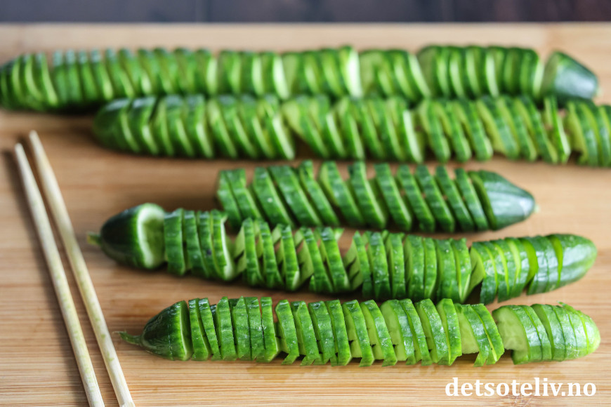 Legg en agurk foran deg. Legg en spisepinne på oversiden og en på undersiden av agurken. Bruk en liten, skarp kniv og skjær agurken i skiver på skrå. Skivene skal være ca. 0,5 cm tykke. Spisepinnene på hver side av agurken forhindrer at du skjærer helt igjennom agurken.
