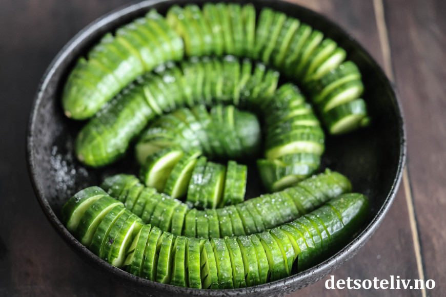 Sett i kjøleskapet i 20 minutter (saltet trekker vann ut av agurkene hvilket gjør dem enda mer crispy).