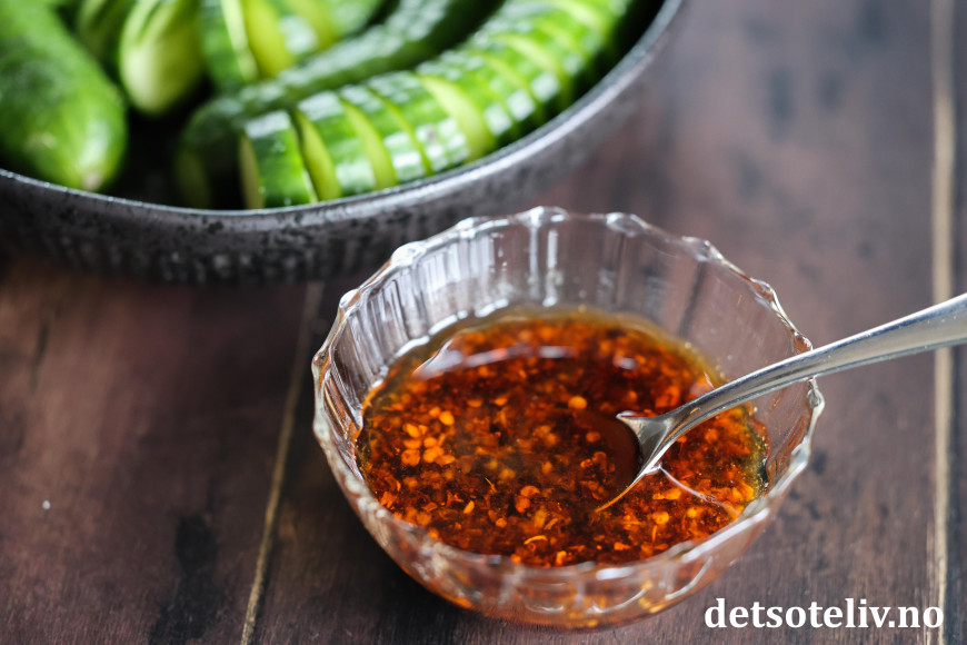 ♥ Du kan justere styrken på disse agurkene med mengden chiliflak du bruker. Jeg brukte her chili crisp, som er en kinesisk-inspirert chiliolje med en litt særegen smak siden den også inneholder stekt løk og krydder (se omtale i innlegget Chili Crisp Fried Eggs Bowl). Alternativt kan du gjerne bruke gochugaru, som er koreanske chiliflak med nokså mild styrke. Ellers kan du bruke hvilken som helst annen type chiliflak som du får kjøpt i norske matbutikker. Det går også fint å sløyfe chiliflak helt hvis du foretrekker det.