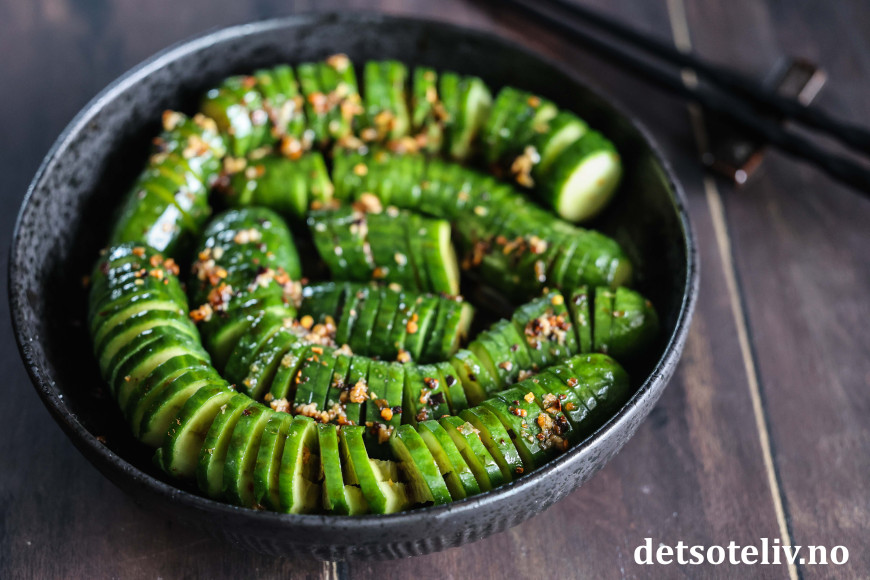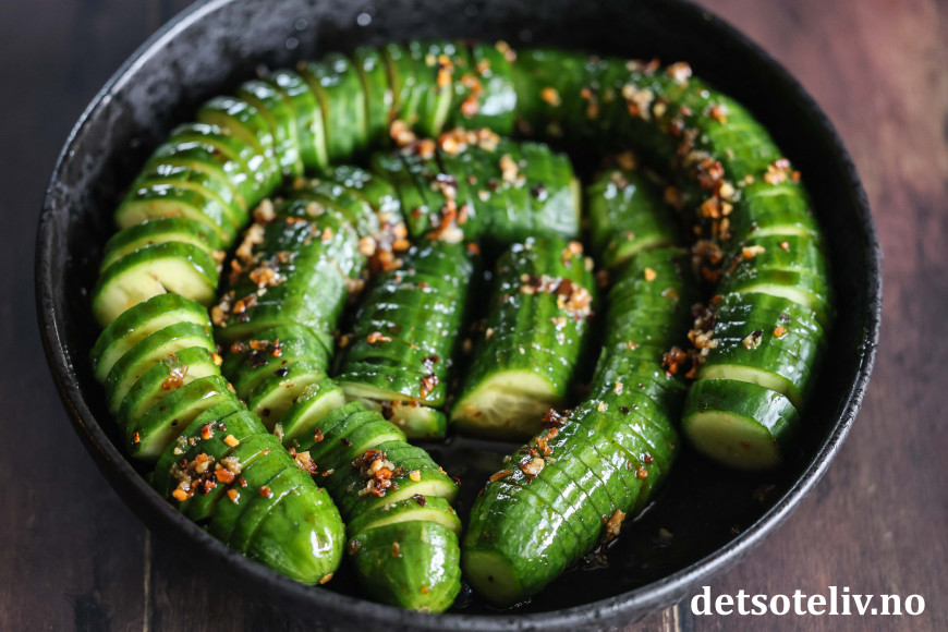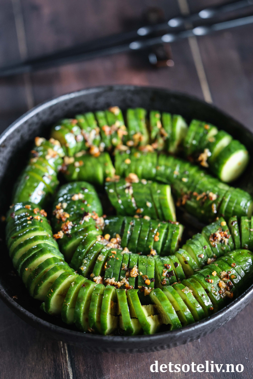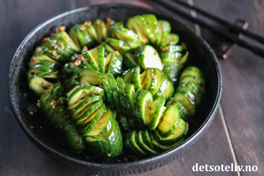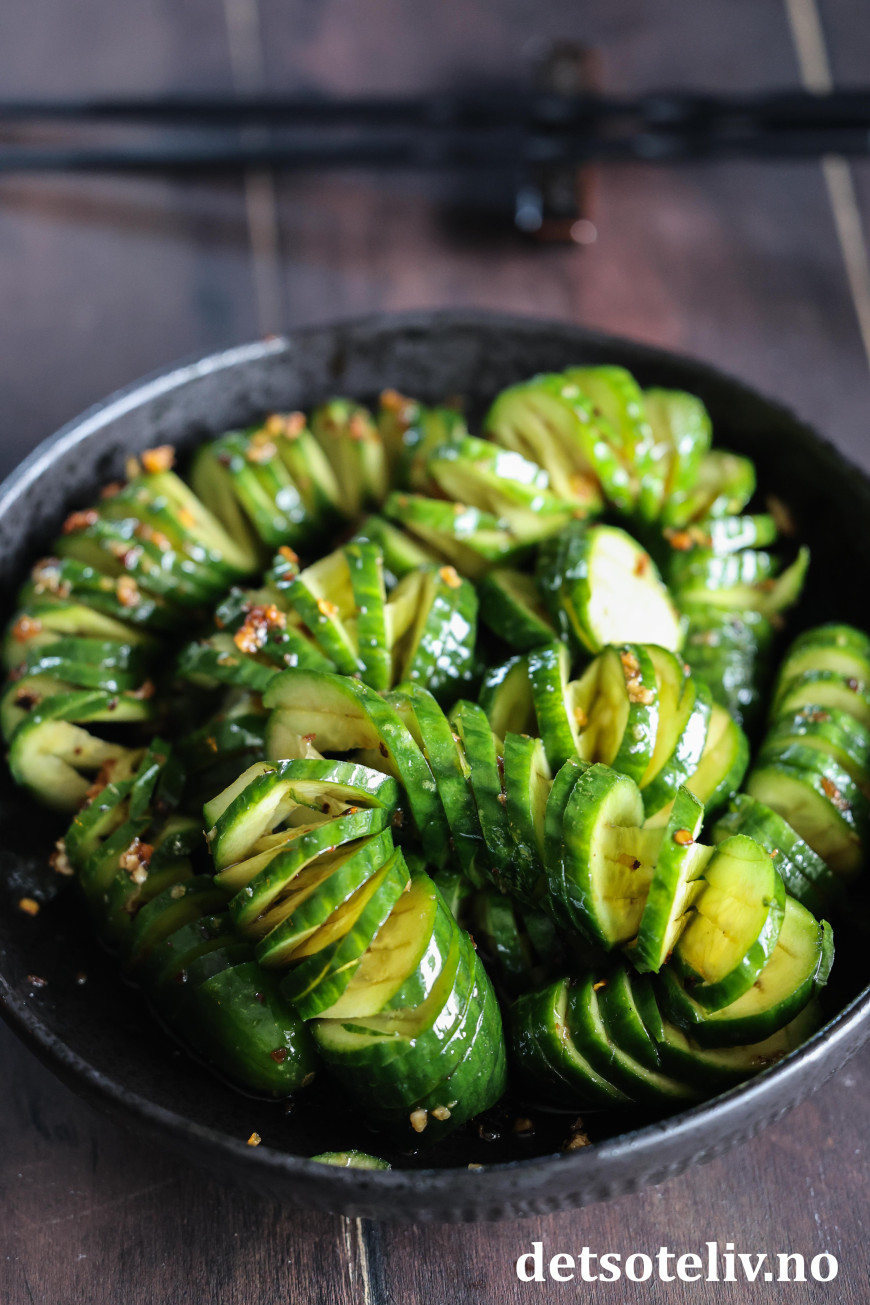 Agurkene ligger i en marinade av soyasaus, riseddik, sesamolje, sukker, hvitløk, chiliflak og sesamfrø. Bruk helst persiske agurker som du får kjøpt i asiatiske matbutikker. Dette er agurker som er mindre i størrelse og mye mer crispy enn de vanlige, store som man får kjøpt i norske matbutikker.