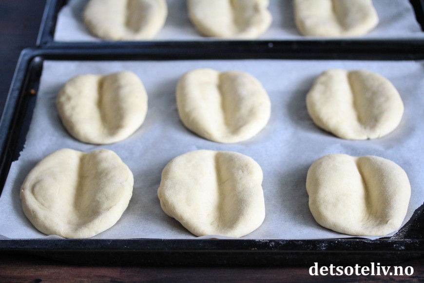 Form hvert emne til avlange boller som tykkes helt flate. Legg dem på bakepapirdekkede stekeplater. La dem deretter heve lunt i 45 minutter.