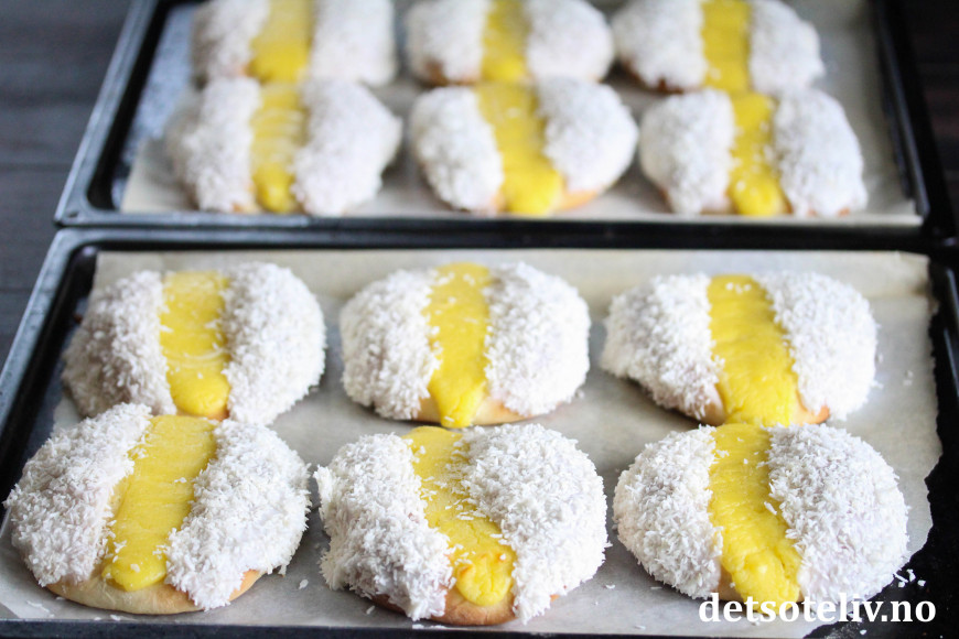 ♥ Det er viktig at du trykker helt ned til platen når du presser ned gropen i de etterhevede bollene. Under steking vil bollene heve seg en god del. Hvis du ikke har presset gropen helt godt ned, vil vaniljekremen flyte over og renne utover bollene under steking.