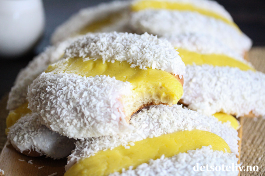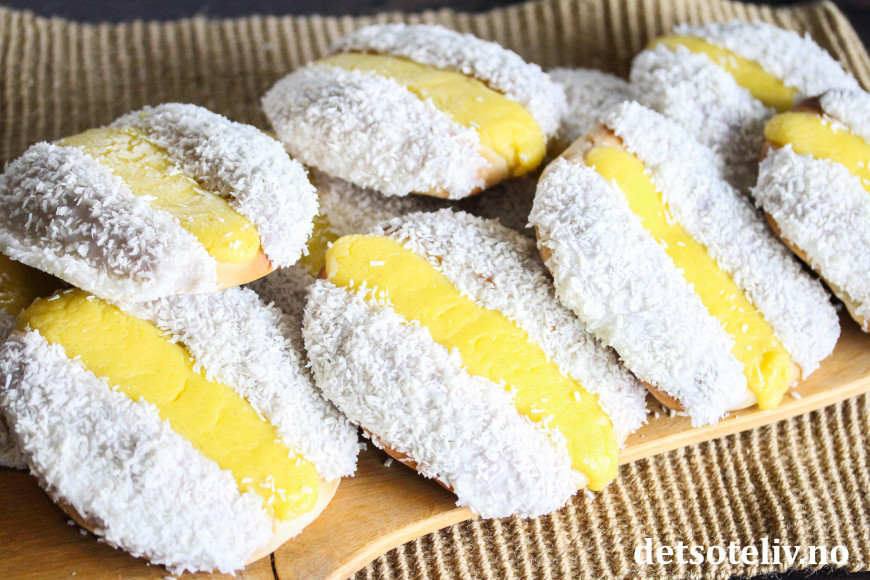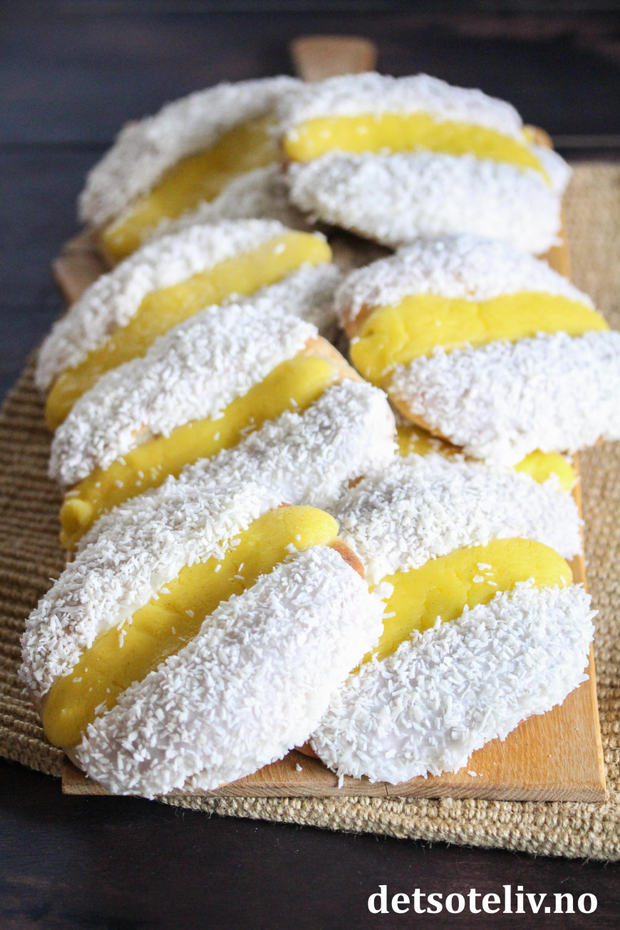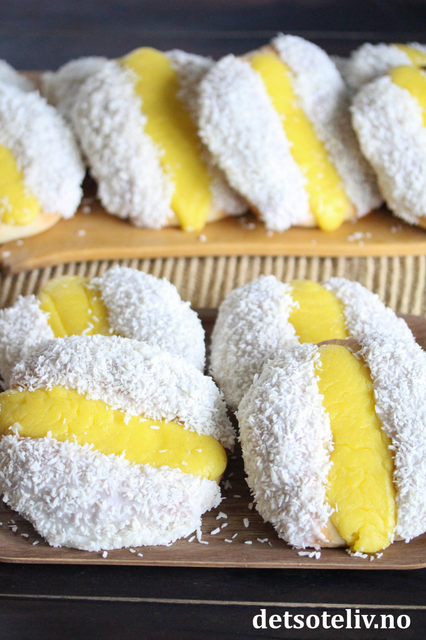 I år lagde jeg en liten vri ved å forme skolebrødene avlange og legge vaniljekremen i en stripe i midten. Noen (særlig på Sørlandet) kaller skolebrødene da for "purker". 😊 Jeg har brukt oppskriften på Verdens beste skolebrød (halv porsjon) og hjemmelaget vaniljekrem (men ferdigkjøpt kan også brukes).