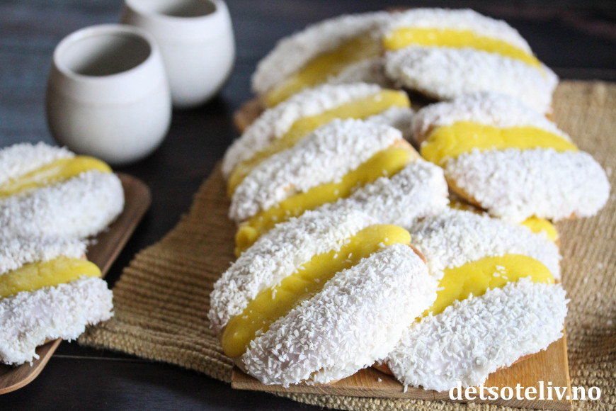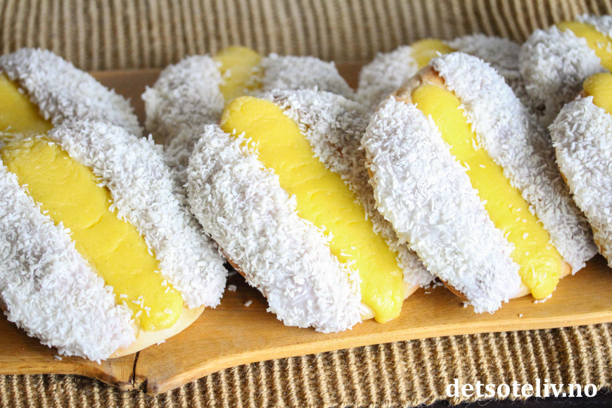 Ha kokos i en skål eller dyp tallerken. Smør melisglasur på bollene på hver side av vaniljekremen. Press sidene på bollene deretter ned i kokosen slik at kokosen fester seg til melisglasuren.