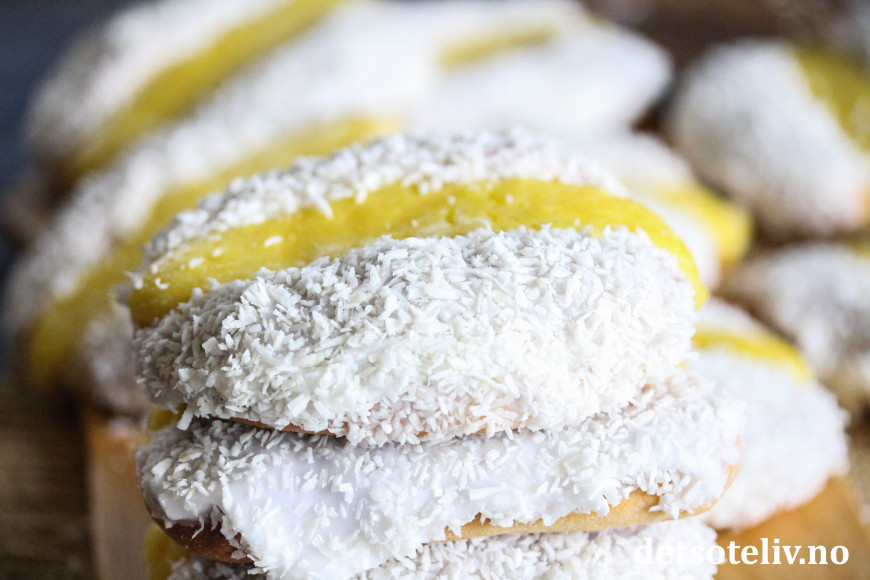 Ha kokos i en skål eller dyp tallerken. Smør melisglasur på bollene på hver side av vaniljekremen. Press sidene på bollene deretter ned i kokosen slik at kokosen fester seg til melisglasuren. La glasuren stivne.