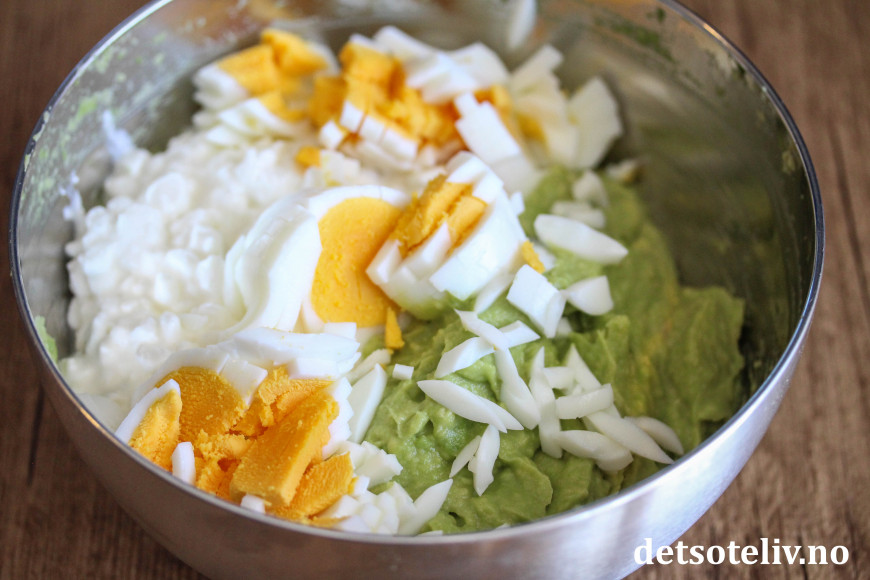 Dette har vært en favoritt lenge: En hjemmelaget påleggssalat laget av most avokado, hakkede, kokte egg og cottage cheese.