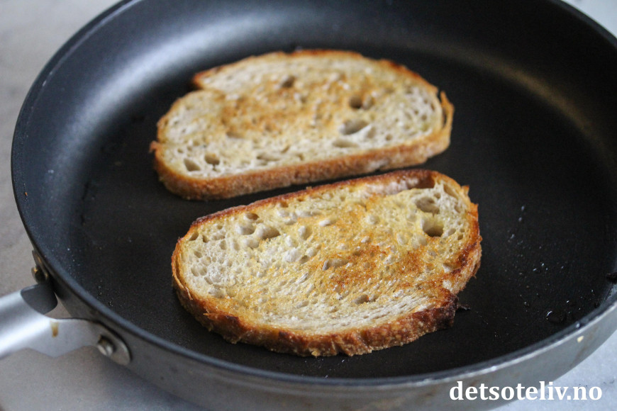 Stek det på begge sider i en stekepanne på middels varme. Drypp olivenolje på begge sidene av brødskivene, slik at de blir sprøe og gode.