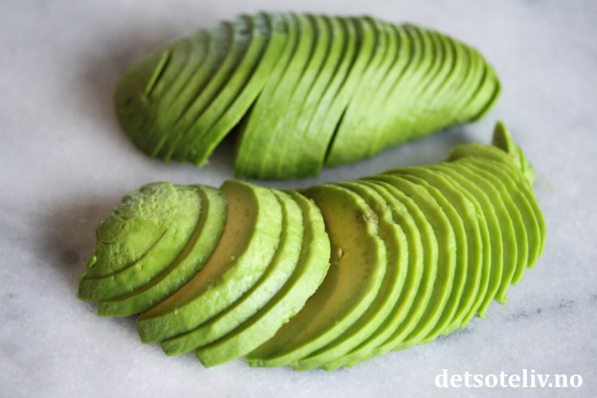 Hvis du vil lage avokadovifte, skjærer du den halve avokadoen i tynne skiver mens du holder den sammen.