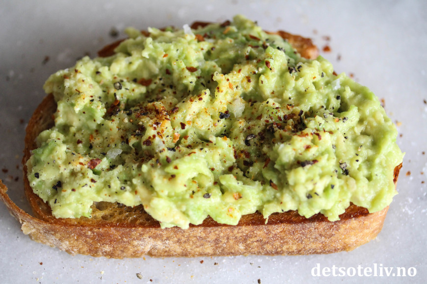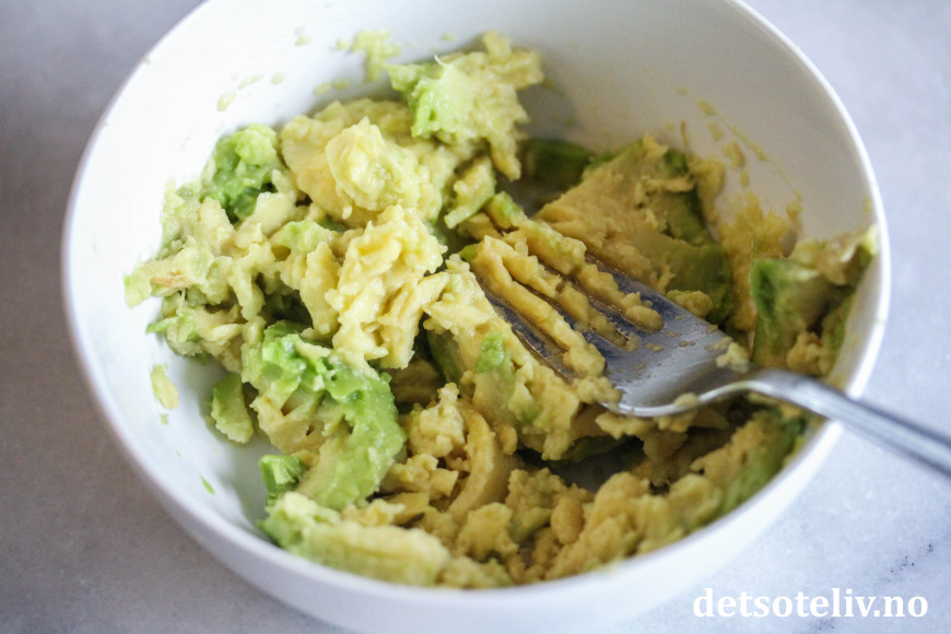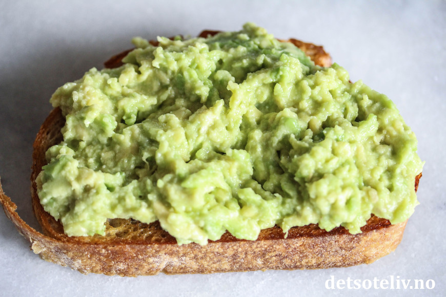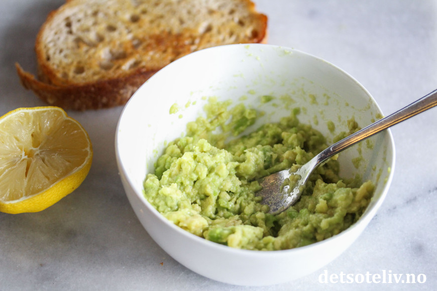 Hvis du vil mose avokadoen, kan du ha en bit rett på toasten og mose den utover med en gaffel. Skal du lage en større porsjon, kan du mose opp avokadokjøttet i en skål først, og så legg en passende porsjon på hver toast.