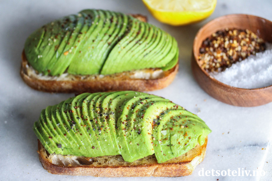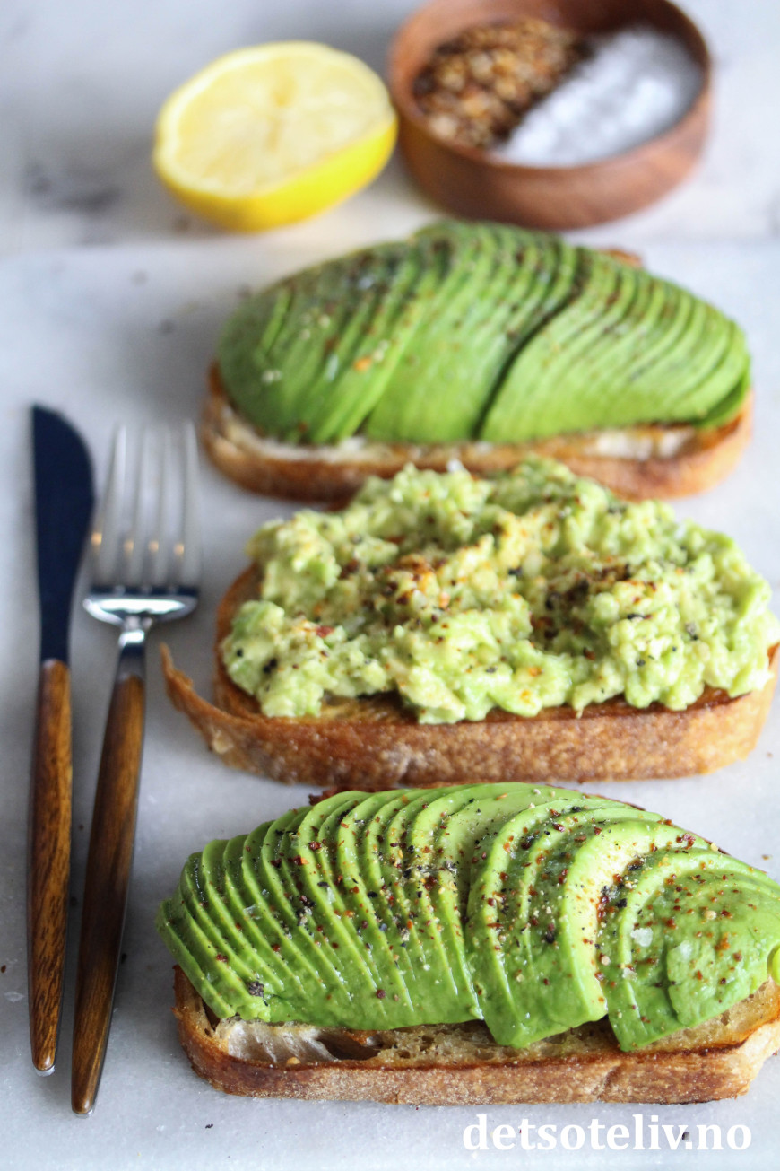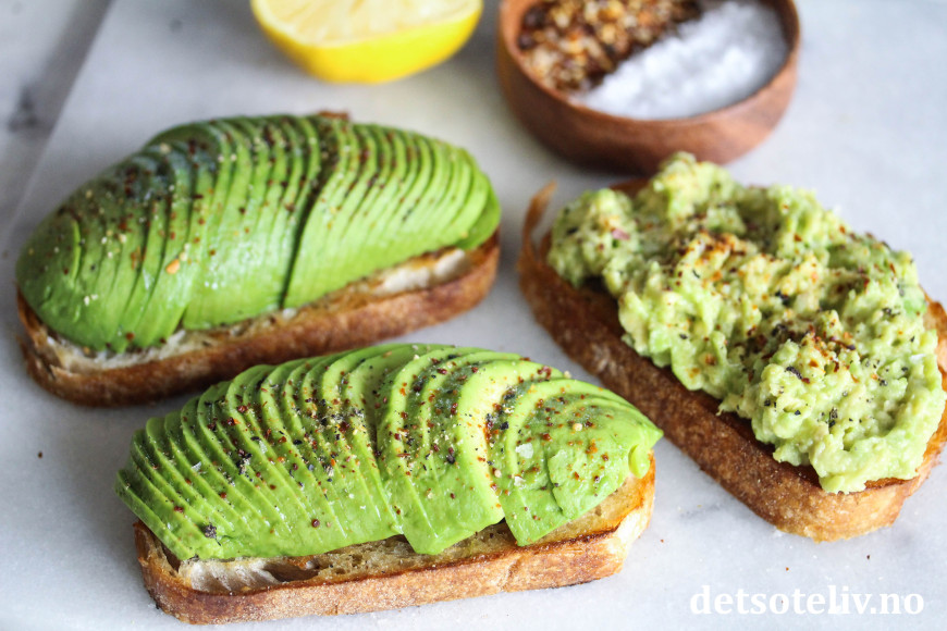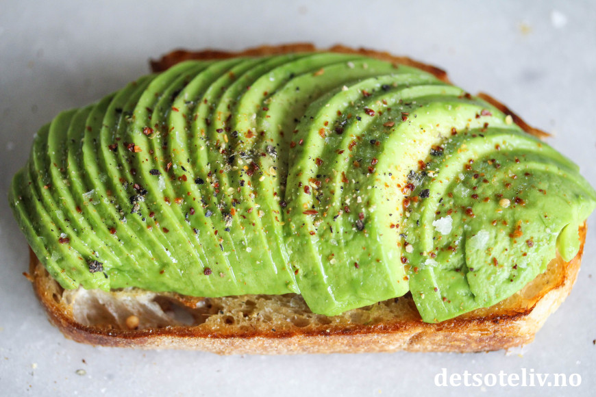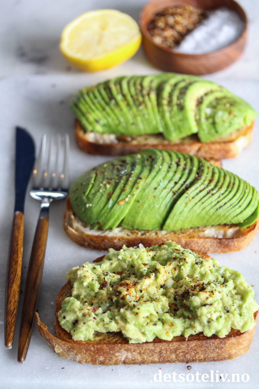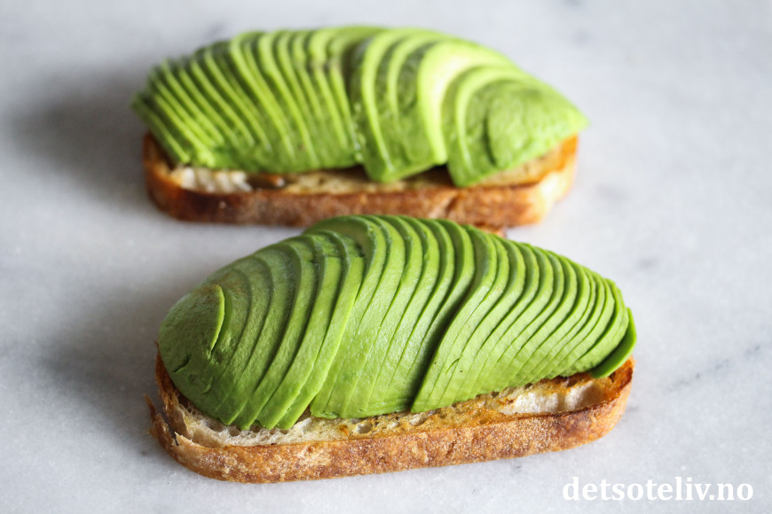 Dersom avokadoen er "perfekt" inni (*lykkefølelse), er det lekkert å skjære halve avokado i tynne skiver og legge på toasten som en vifte. Men det går også helt utmerket å mose avokadoen på toasten, som gir en vel så populær "Smashed Avocado Toast".