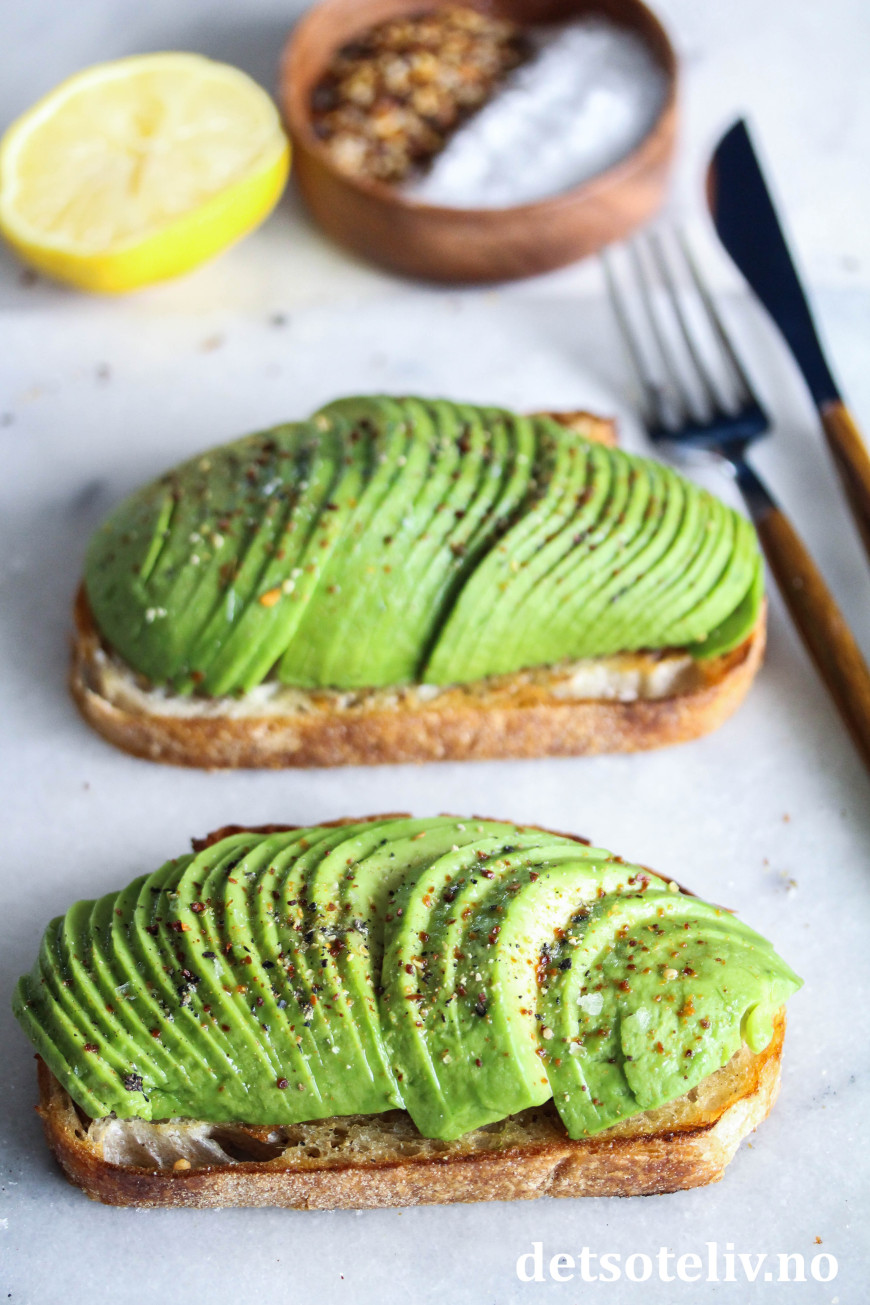 Avokadotoast kan gjerne dekkes med marinerte tomater, egg eller annet godt oppå avokadoen, men toasten er også nydelig helt plain. Jeg liker å skvise over litt sitron og krydre med flaksalt, pepper og chiliflakes. Jeg bruker skiver av landbrød eller surdeigsbrød som stekes crunchy i stekepanne med olivenolje.