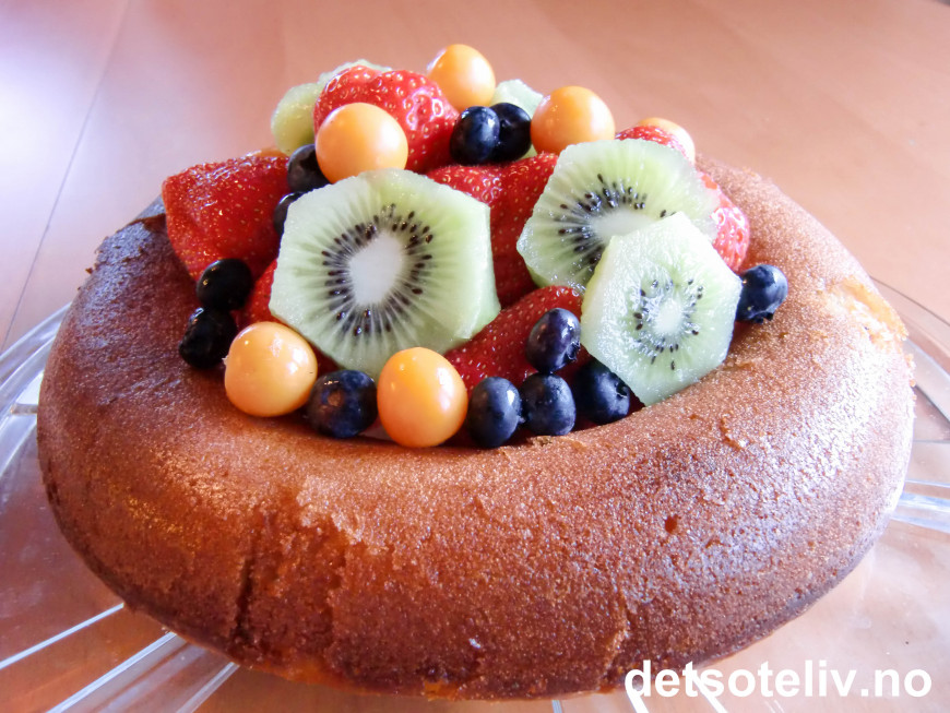 Hvelv kaken over på et fat. Fyll hullet i midten med rikelige mengder frukt og bær. Server kaken med lettpisket krem.