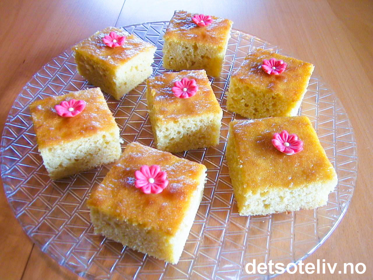 Ha deigen i en liten, bakepapirkledd langpanne (ca 20x30 cm). Stek kaken midt i ovnen ved 175°C i ca 30 min (sjekk med kakenål). Avkjøl kaken helt i formen. Hvelv kaken ut av formen og fjern bakepapiret. Del kaken opp i passe store firkanter.