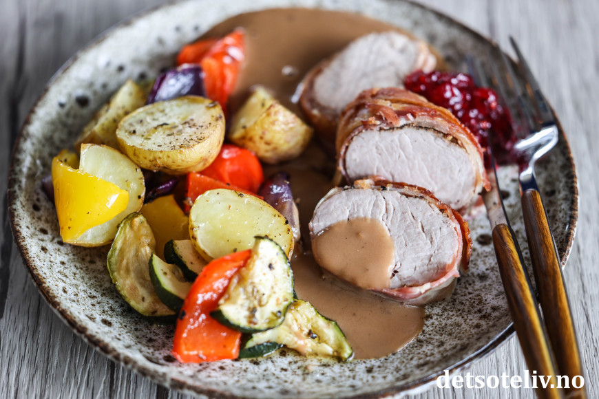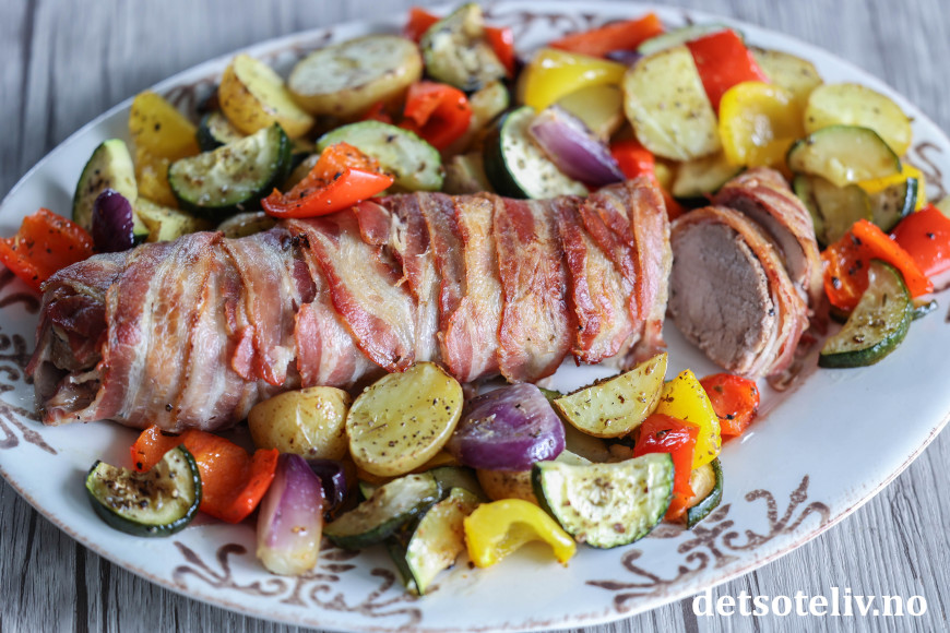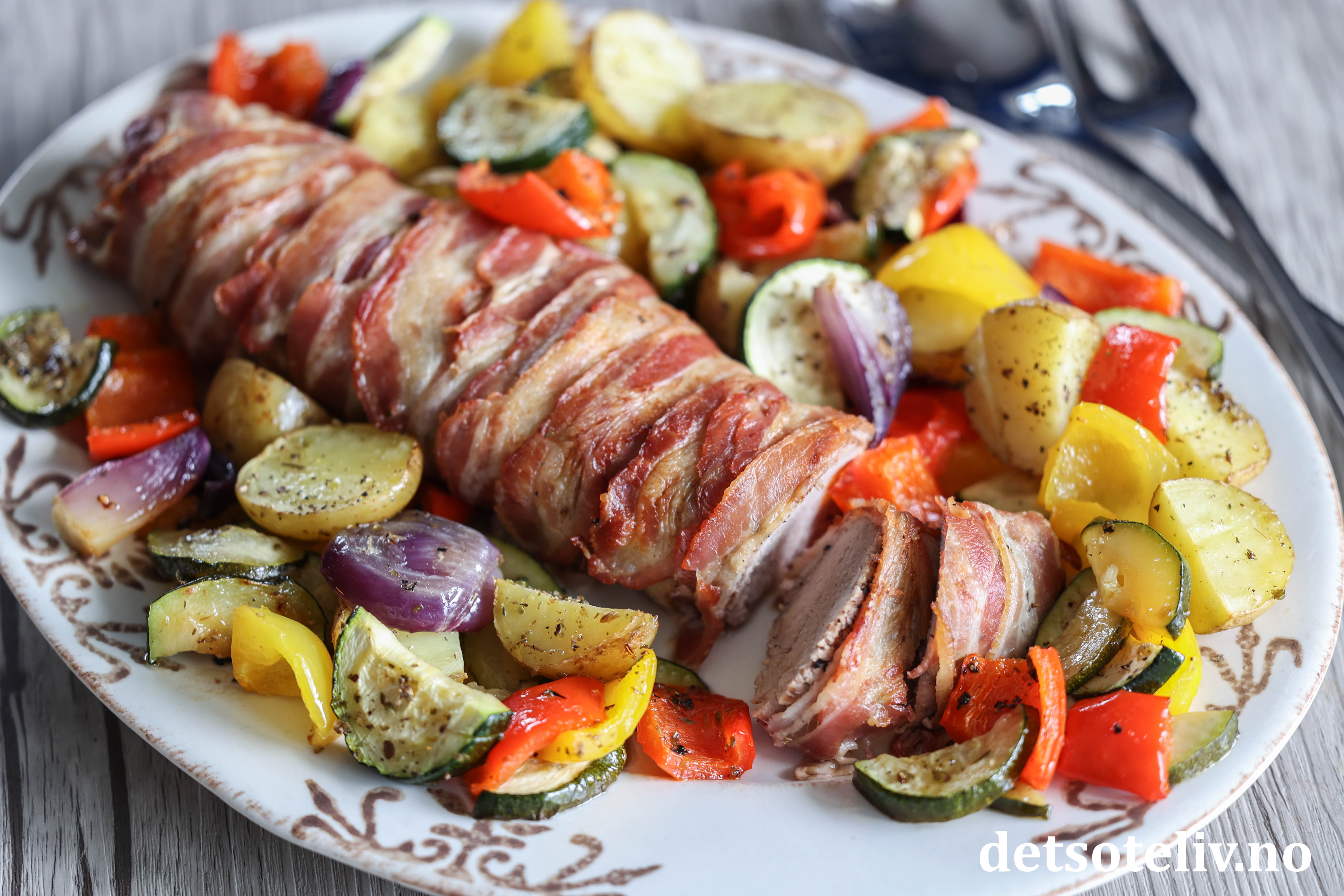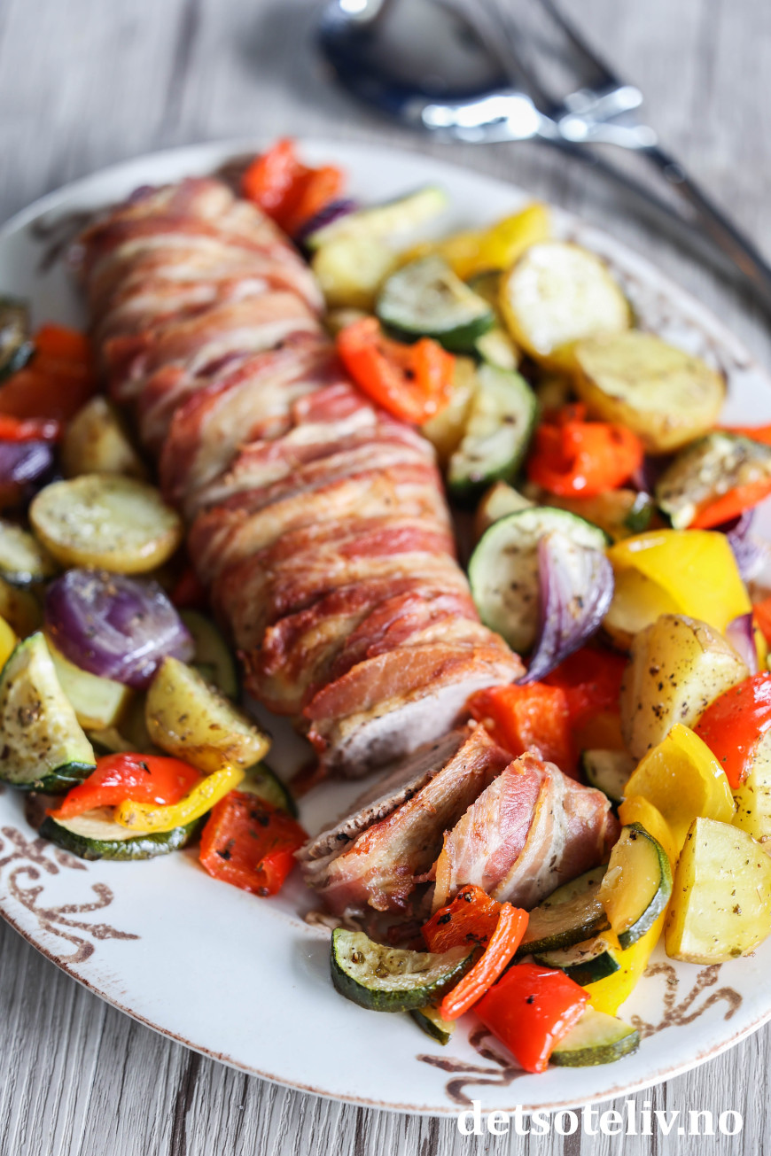 Server baconsurret svinefilet sammen med ovnsbakte grønnsaker og poteter.