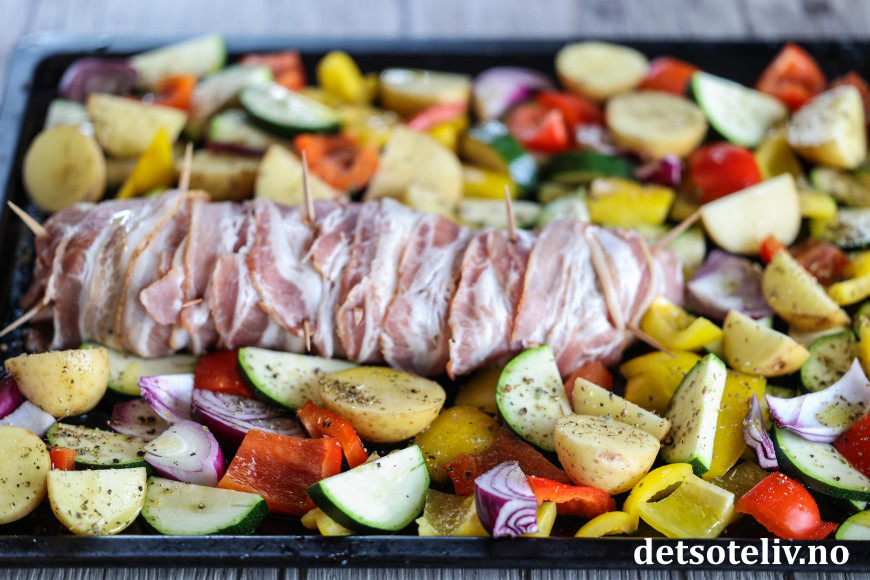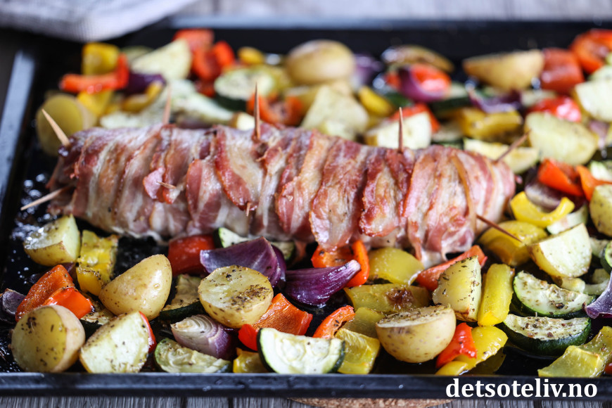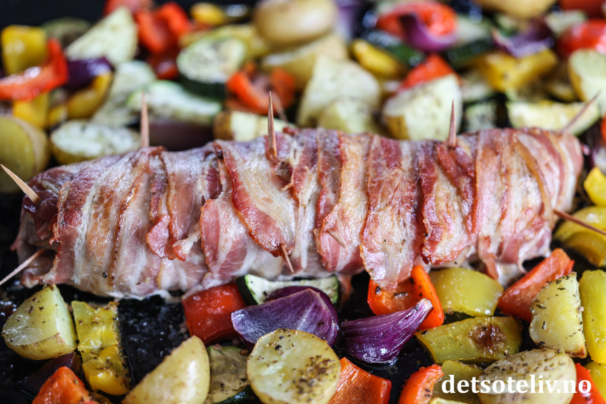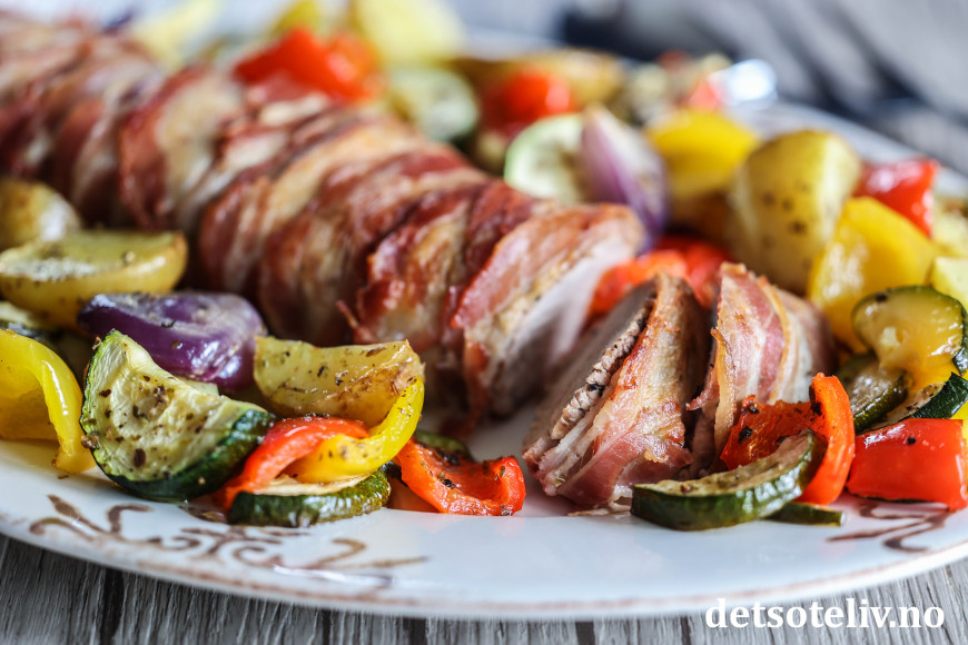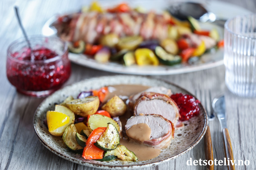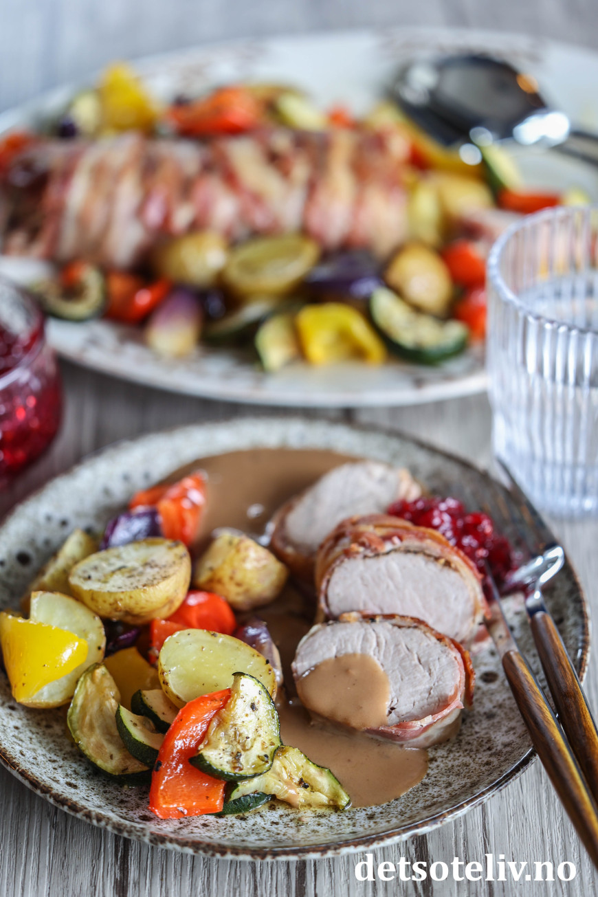 Server baconsurret svinefilet sammen med ovnsbakte grønnsaker og poteter.