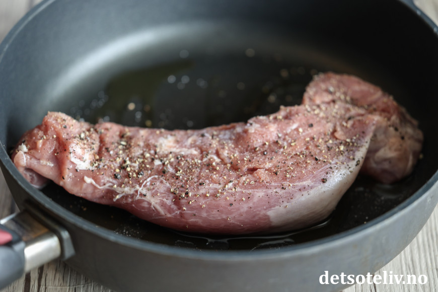 Varm opp en stekepanne med litt olje. Legg i svinefileten og krydre godt med salt og pepper.