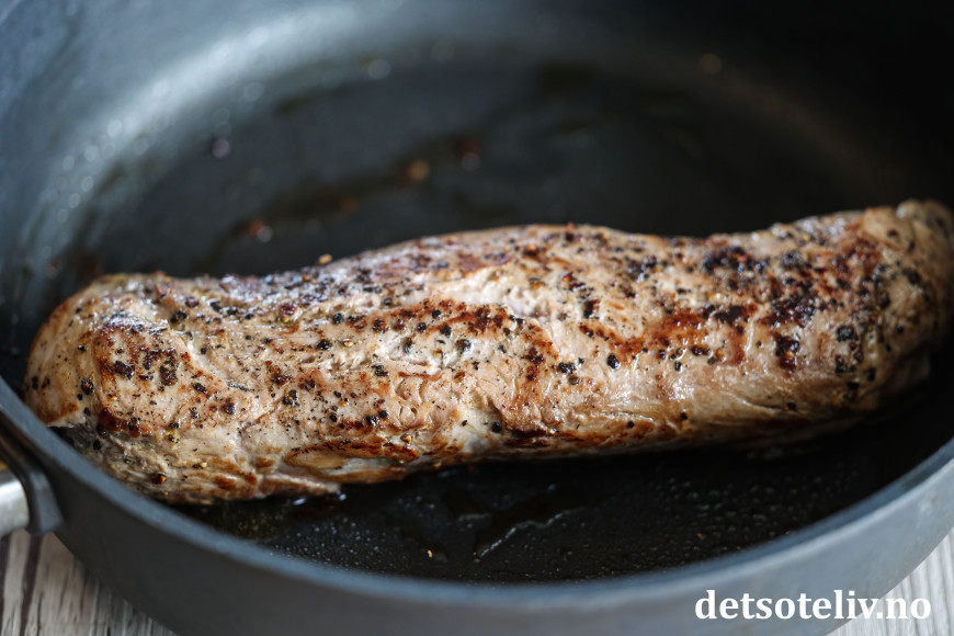 Stek svinefileten på høy varme slik at den blir godt brunet på alle sider.