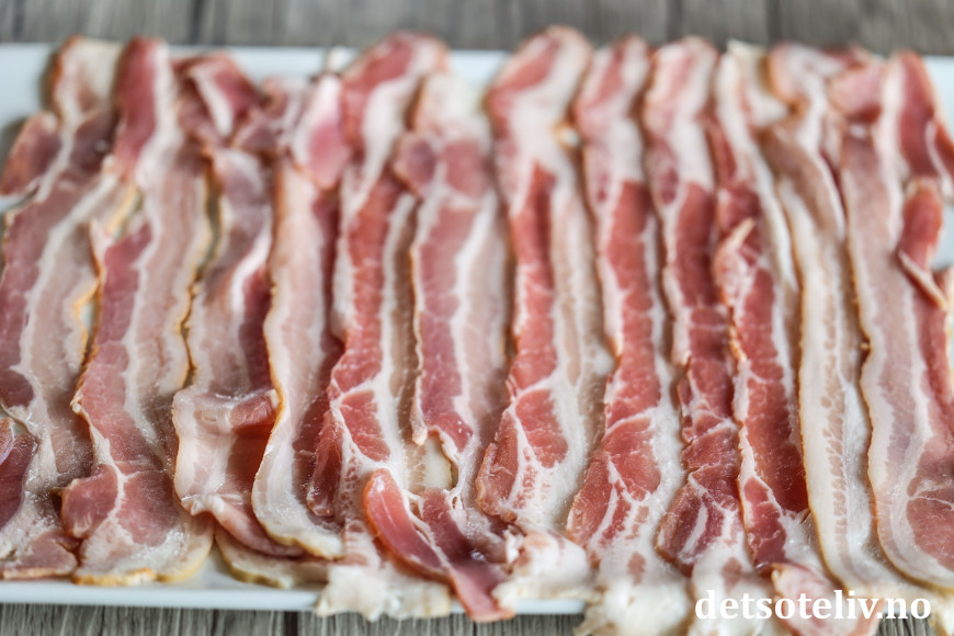 Legg baconskivene ved siden av hverandre på et brett, lett overlappende.