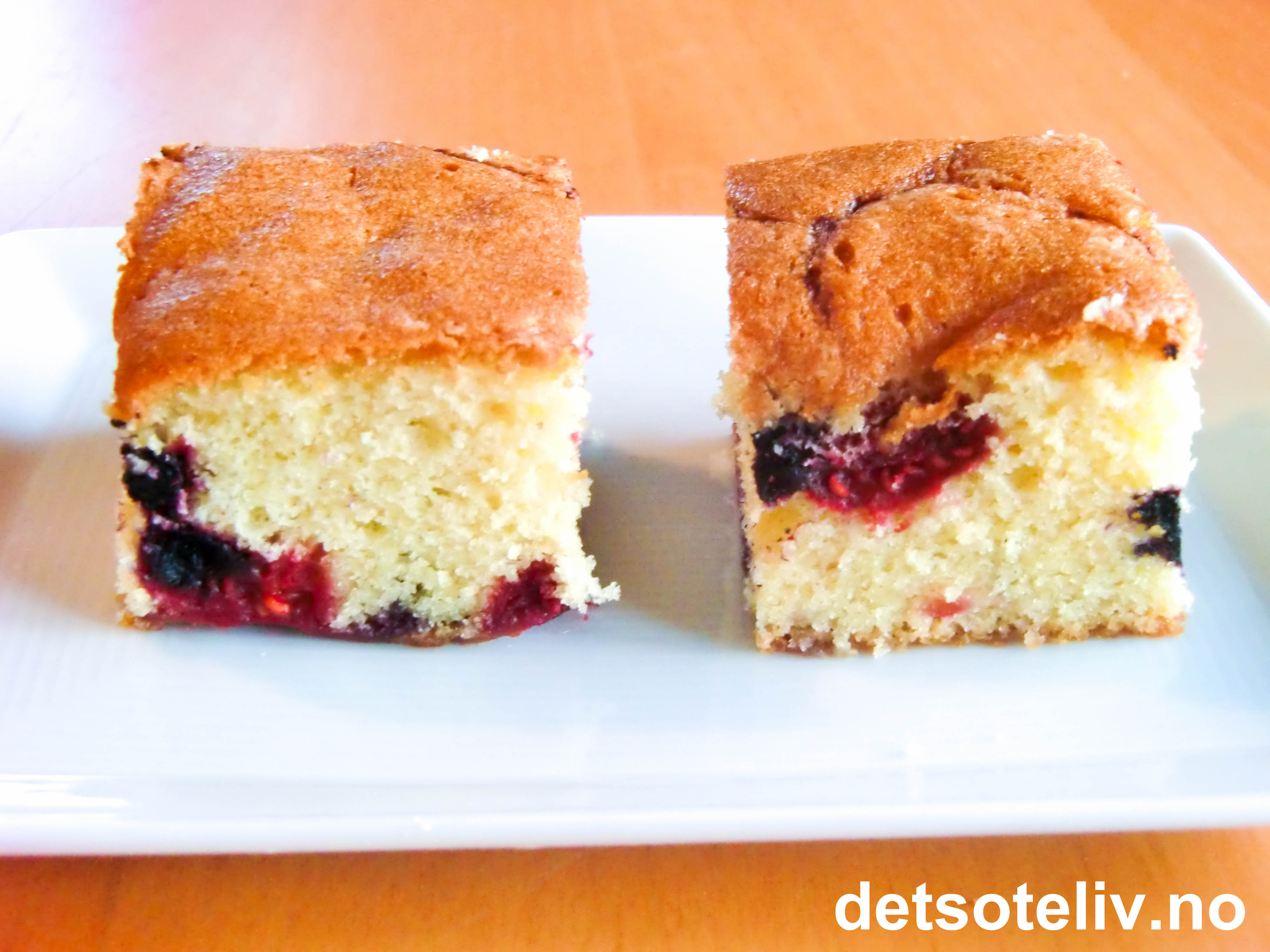 Kakestykkene kan fryses. Se også en litt annerledes oppskrift på "Bærkake i stor langpanne".