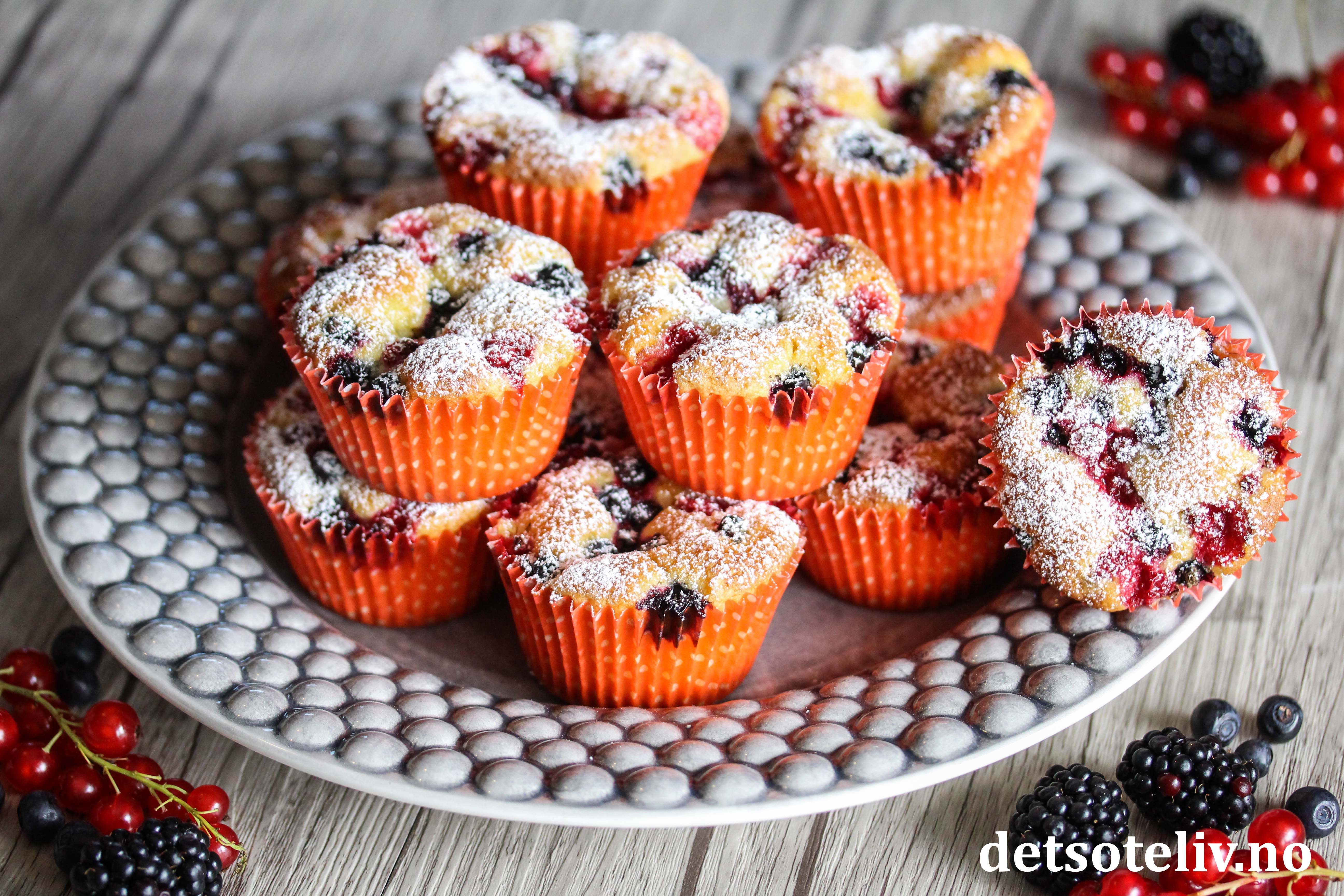 Jeg brukte her en blanding av rips, solbær og skogsblåbær. Bruker du større bær, bør du skjære dem i mindre biter før du legger dem på muffinsene, ellers vil bærene synke til bunns under stekingen.