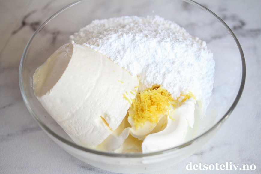 Til ostefyllet piskes først kremost, crème fraîche, melis og revet sitronskall sammen.