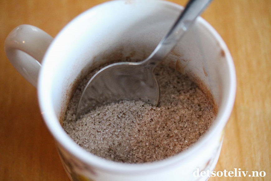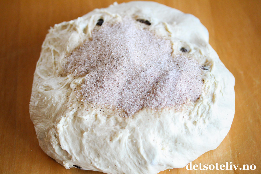 Bland sukker og kanel i en skål. Ha deigen på bakebordet og kna sukker- kanelblandingen litt og litt inn i deigen. Det er bare fint hvis kanelsukkeret ikke blir helt jevnt knadd inn, men etterlater noen kanelstriper i deigen. Sukkeret vil gjøre at deigen etter hvert kjennes litt "våt", men det er helt som det skal være. La deigen heve lunt i 1,5 time.