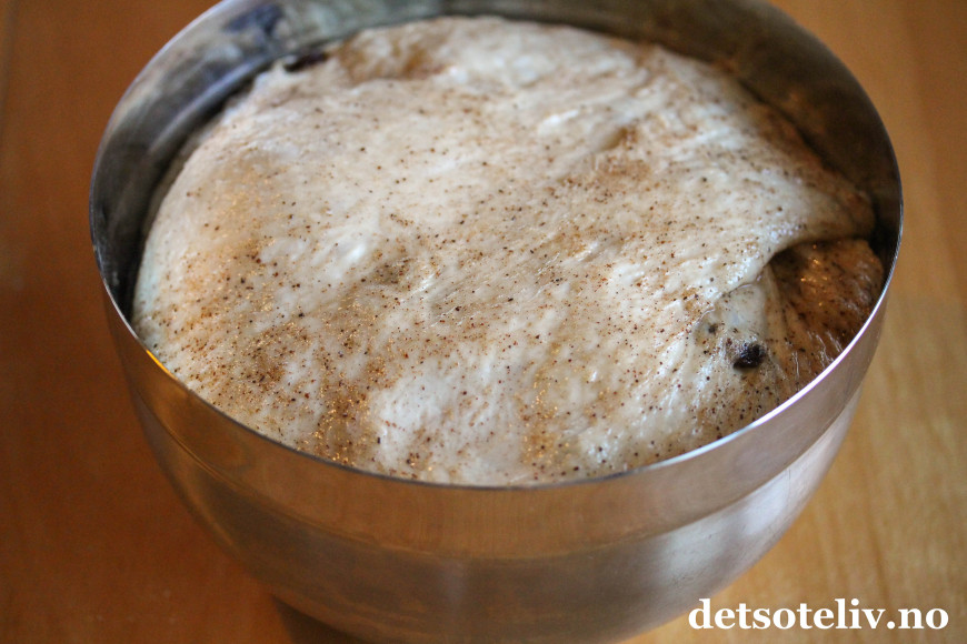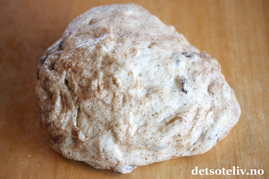 Bland så inn hvetemelet. Elt deigen i kjøkkenmaskin med eltekrok i 5-10 minutter. Deigen skal være temmelig fast. Tilsett rosinene og elt videre 1 minutt til så de blander seg godt inn i deigen og blir littegrann moste.