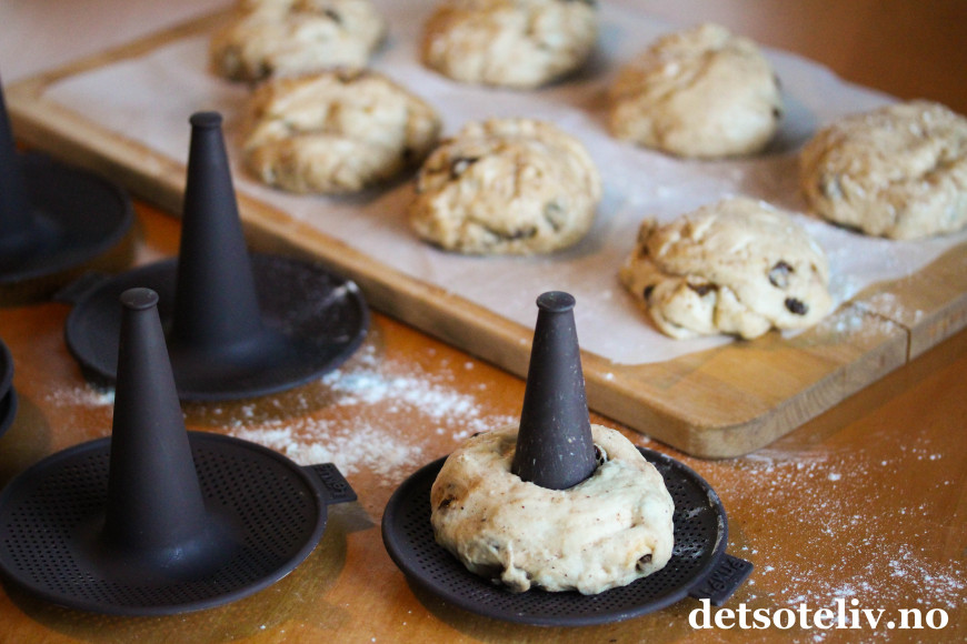 Hvis du har bagelformer, kan du tre hver ring på hver sin bagelform. Hvis du ikke har slike bagelformer, er det viktig å lage hullene i midten av bollene store nok (ca. 4-5 cm i diameter), så ikke hullet vokser sammen under stekingen.