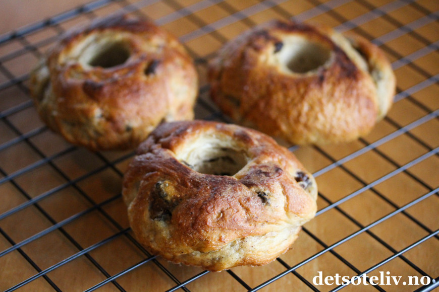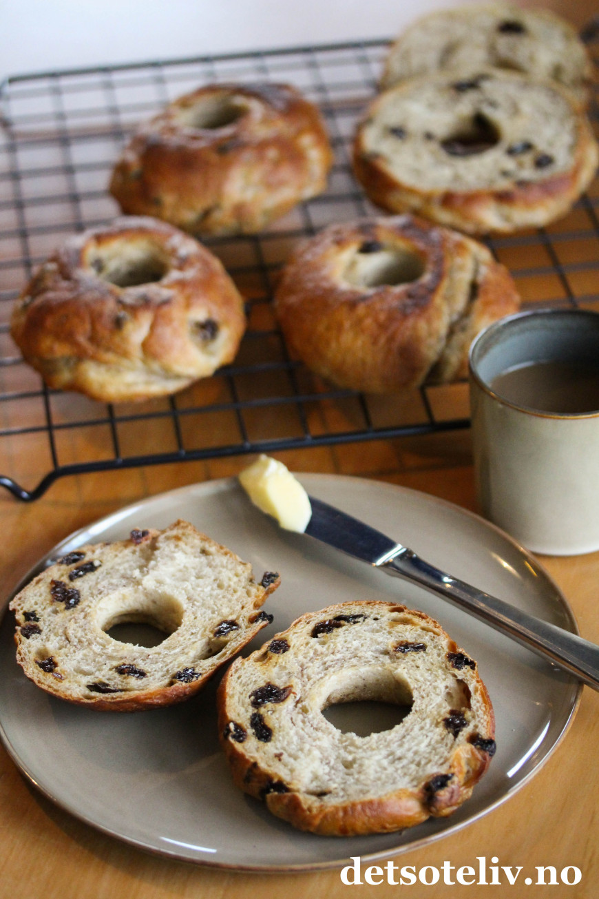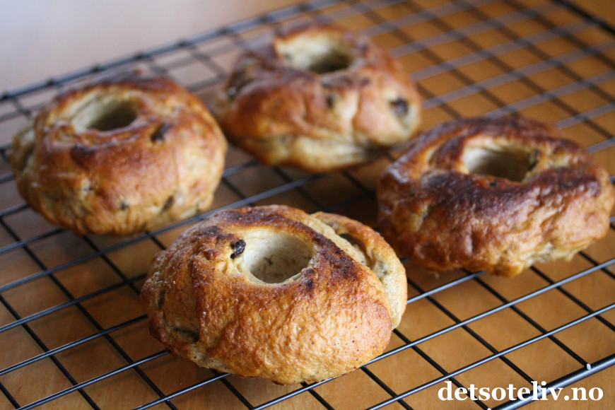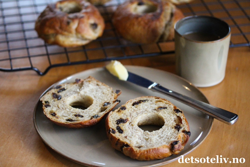 Jeg har lenge hatt lyst til å prøve meg på hjemmelagde bagels. De er jo så gode - og særlig de søte variantene! "Cinnamon Rainsin Bagels" forbinder jeg personlig med New York, for det var der jeg smakte disse første gangen. Jeg husker jeg fikk dem servert varme med smør og honning, og de var fantastiske!