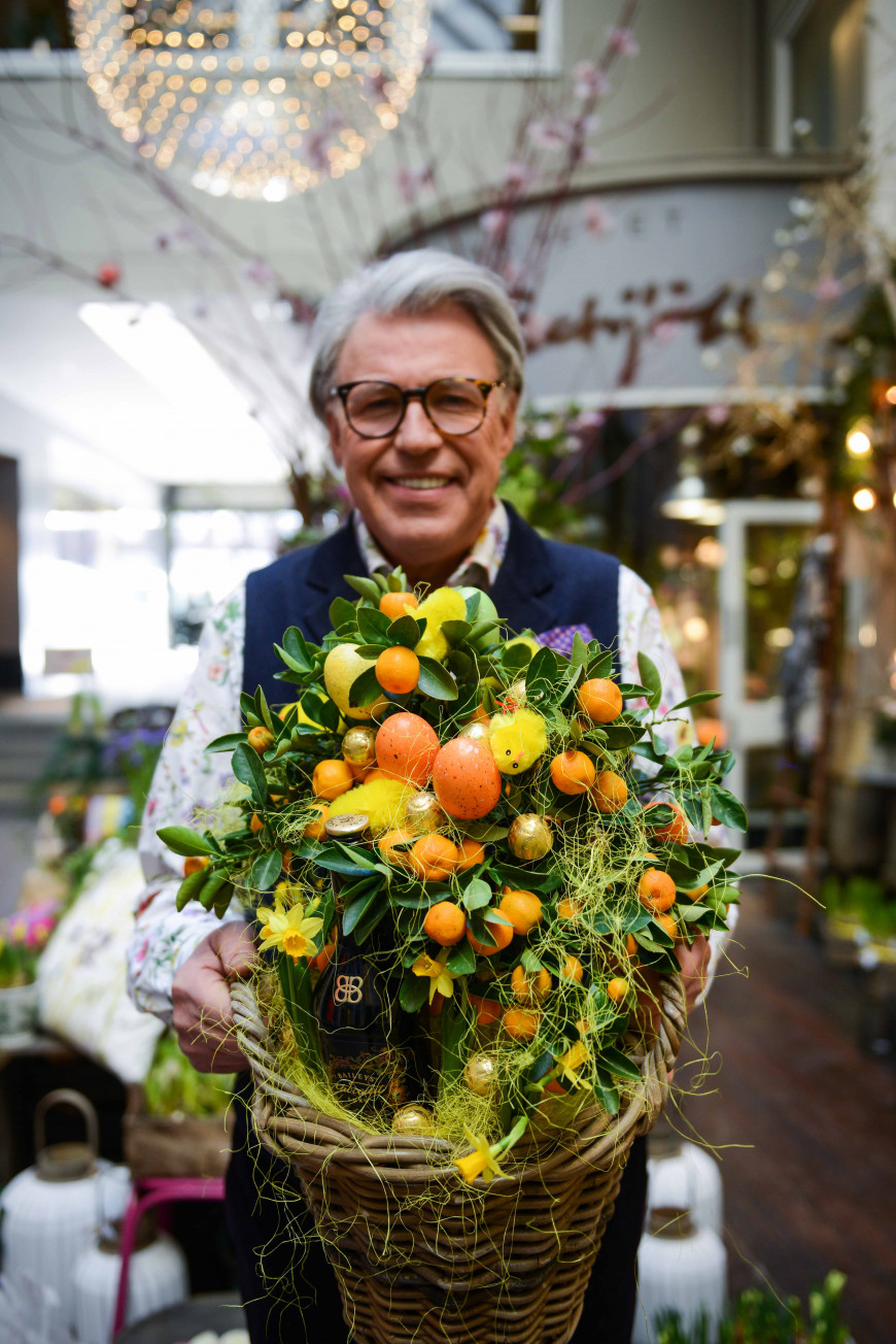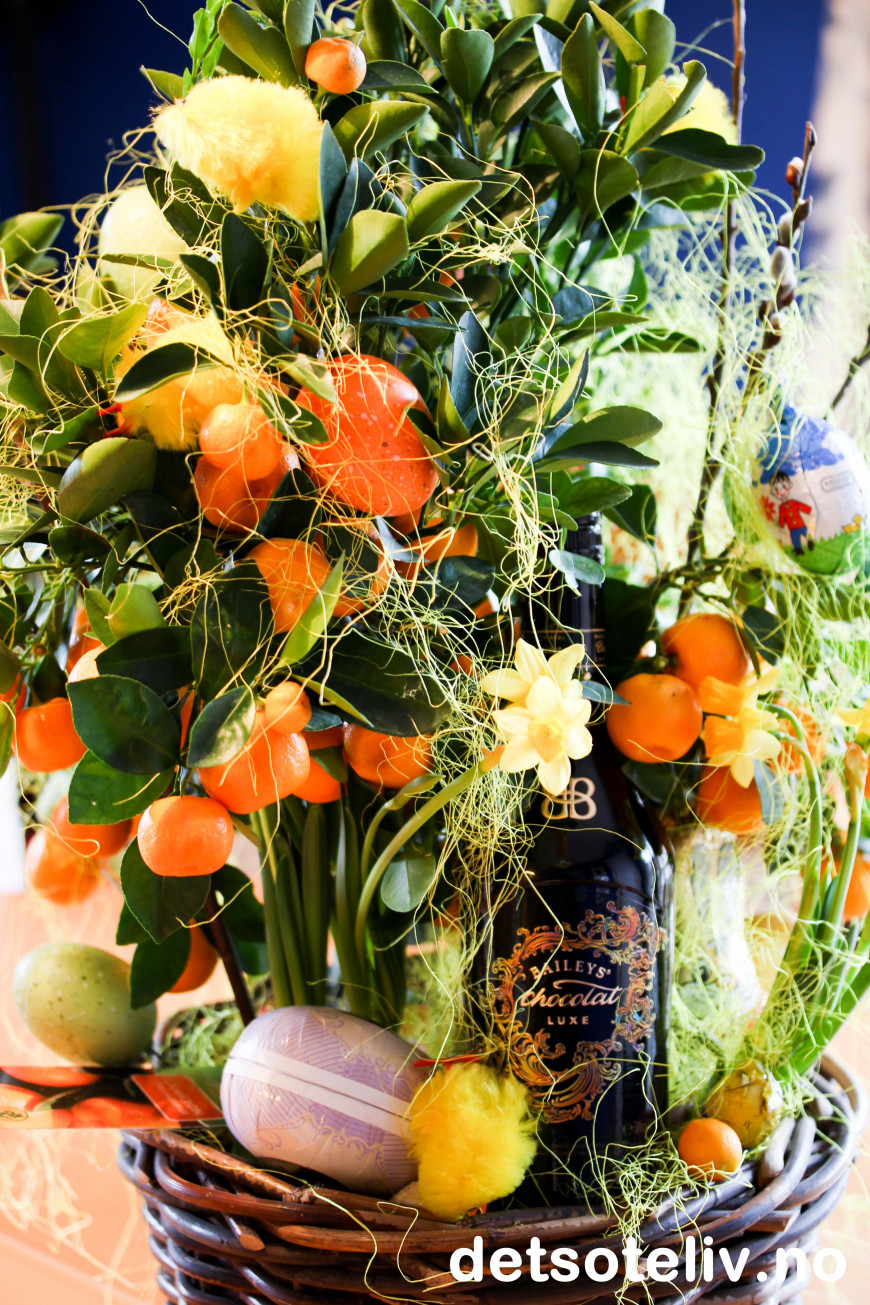 Et aldri så lite påsketre med bittesmå appelsinliknende frukter, påskesjokolader og i midten en flaske Baileys Chocolat Luxe!