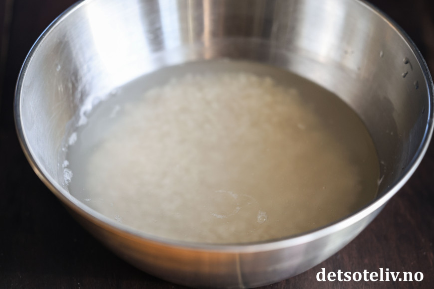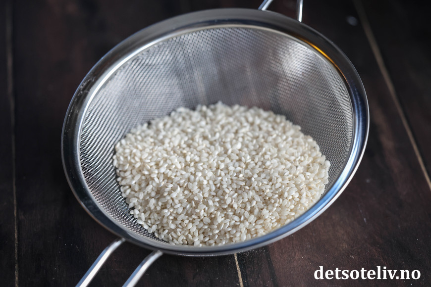 La risen ligge i vannet i 20 minutter før du har risen i silen og heller av vannet. Skyll risen på nytt og ha den så i en kjele.