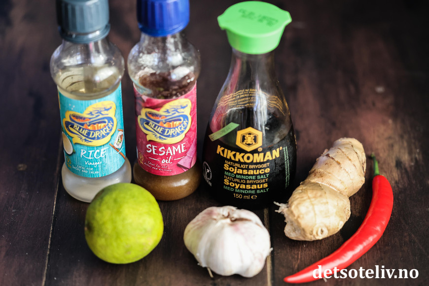 Bland soyasaus med riseddik og presset saft fra lime. Rør inn sukker og sesamolje. Press hvitløksfeddet, finhakk ingefær og chili og bland inn. Smak til slik at du får ponzusausen slik du liker den best!