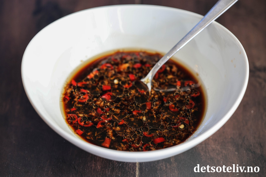 Serveres nylaget med resten av ponzusausen og ekstra chilimajones som tilbehør.