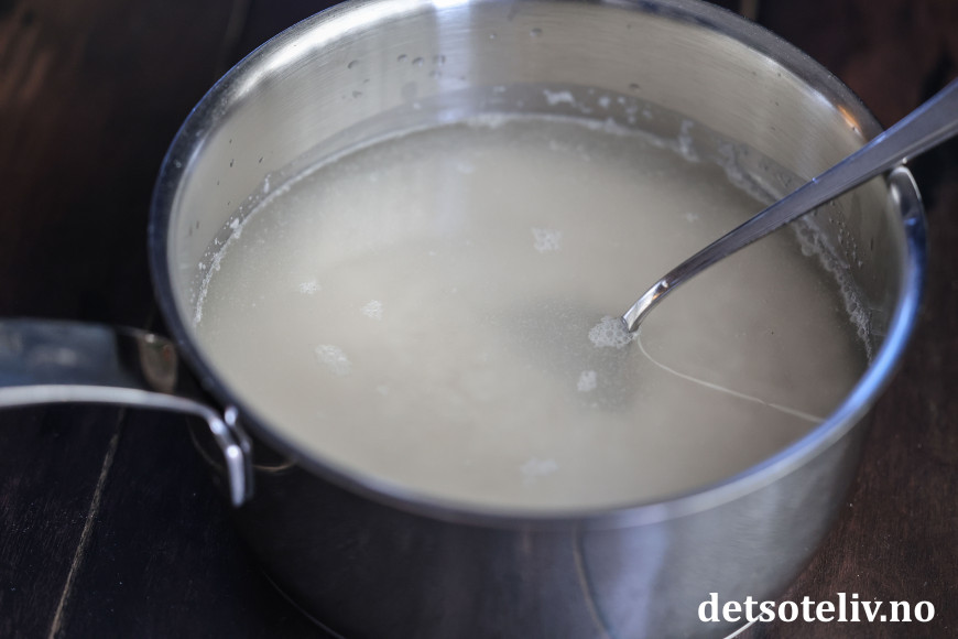 Tilsett 4 dl vann og varm opp til kokepunktet.