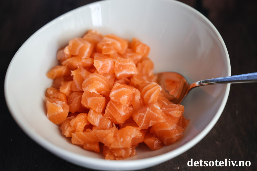 Skjær laksefileten i små biter. Ha bitene i en skål.