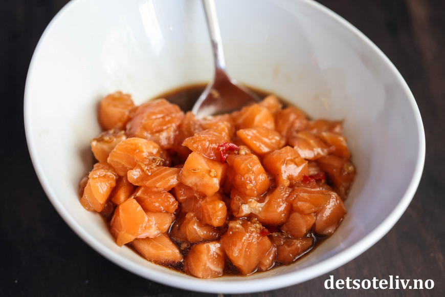 Hell over halvparten av ponzusausen og bland godt. Sett skålen med laksebitene i kjøleskapet, og la de marinere i ponzusausen i minst 30 minutter.